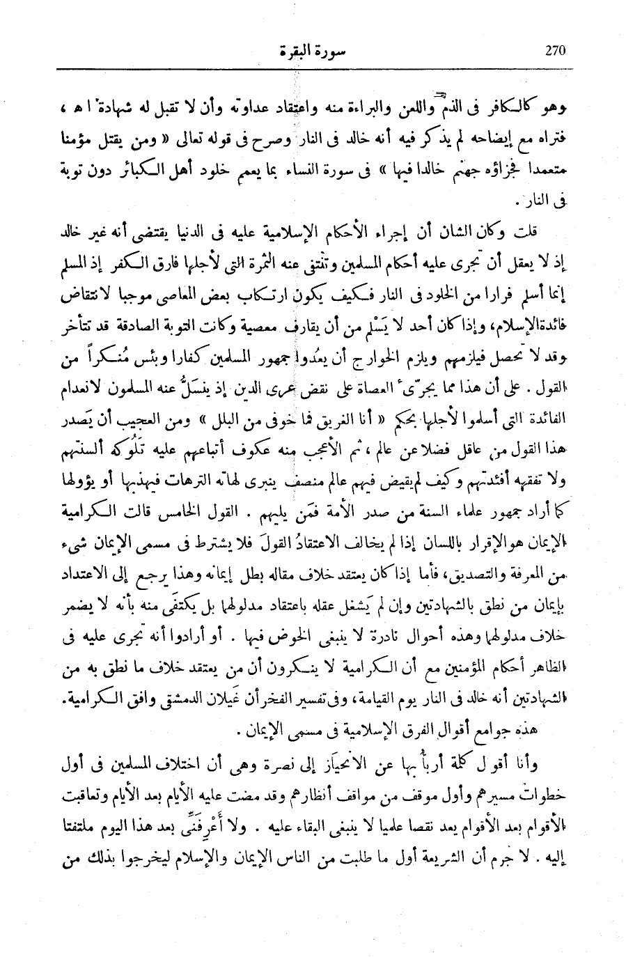 هَذِهِ جَوَامِعُ أَقْوَالِ الْفِرَقِ الْإِسْلَامِيَّةِ فِي مُسَمَّى الْإِيمَانِ. وَأَنَا أَقُولُ كَلِمَةً أَرْبَأُ بِهَا عَنِ الِانْحِيَازِ إِلَى نُصْرَةٍ وَهِيَ أَنَّ اخْتِلَافَ الْمُسْلِمِينَ فِي أَوَّلِ خُطُوَاتِ مَسِيرِهِمْ وَأَوَّلِ مَوْقِفٍ مِنْ مَوَاقِفِ أَنْظَارِهِمْ وَقَدْ مَضَتْ عَلَيْهِ الْأَيَّامُ بَعْدَ الْأَيَّامِ وَتَعَاقَبَتِ الْأَقْوَامُ بَعْدَ الْأَقْوَامِ يُعَدُّ نَقْصًا عِلْمِيًّا لَا يَنْبَغِي الْبَقَاءُ عَلَيْهِ، وَلَا أَعْرِفُنِي بَعْدَ هَذَا الْيَوْمِ مُلْتَفِتًا إِلَيْهِ.