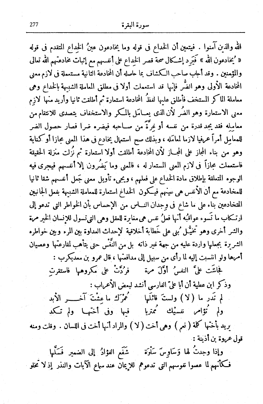فَيَضُرُّهُ ضُرًّا فَصَارَ حُصُولُ الضُّرِّ لِلْمُعَامَلِ أَمْرًا عُرْفِيًّا لَازِمًا لِمُعَامِلِهِ، وَبِذَلِكَ صَحَّ اسْتِعْمَالُ يُخَادِعُ فِي هَذَا الْمَعْنَى مَجَازًا أَوْ كِنَايَةً وَهُوَ مِنْ بِنَاءِ الْمَجَازِ عَلَى الْمَجَازِ لِأَنَّ الْمُخَادَعَةَ أُطْلِقَتْ أَوَّلًا اسْتِعَارَةً ثُمَّ نُزِّلَتْ مَنْزِلَةَ الْحَقِيقَةِ فَاسْتُعْمِلَتْ مَجَازًا فِي لَازِمِ الْمَعْنَى الْمُسْتَعَارِ لَهُ، فَالْمَعْنَى وَمَا يَضُرُّونَ إِلَّا أَنْفُسَهُمْ فَيَجْرِي فِيهِ الْوُجُوهُ الْمُتَعَلِّقَةُ بِإِطْلَاقِ مَادَّةِ الْخِدَاعِ عَلَى فِعْلِهِمْ، وَيَجِيءُ تَأْوِيلُ مَعْنَى جَعْلِ أَنْفُسِهِمْ شِقًّا ثَانِيًا لِلْمُخَادَعَةِ مَعَ أَنَّ الْأَنْفُسَ هِيَ عَيْنُهُمْ فَيَكُونُ الْخِدَاعُ اسْتِعَارَةً لِلْمُعَامَلَةِ الشَّبِيهَةِ بِفِعْلِ الْجَانِبَيْنِ الْمُتَخَادِعَيْنِ بِنَاءً عَلَى مَا شَاعَ فِي وِجْدَانِ النَّاسِ مِنَ الْإِحْسَاسِ بِأَنَّ الْخَوَاطِرَ الَّتِي تَدْعُو إِلَى ارْتِكَابِ مَا تَسُوءُ عَوَاقِبُهُ أَنَّهَا فِعْلُ نَفْسٍ هِيَ مُغَايِرَةٌ لِلْعَقْلِ وَهِيَ الَّتِي تُسَوِّلُ لِلْإِنْسَانِ الْخَيْرَ مَرَّةً وَالشَّرَّ أُخْرَى وَهُوَ تَخَيُّلٌ بُنِيَ عَلَى خَطَابَةٍ أَخْلَاقِيَّةٍ لِإِحْدَاثِ الْعَدَاوَةِ بَيْنَ الْمَرْءِ وَبَيْنَ خَوَاطِرِهِ الشِّرِّيرَةِ بِجَعْلِهَا وَارِدَةً عَلَيْهِ مِنْ جِهَةٍ غَيْرِ ذَاتِهِ بَلْ مِنَ النَّفْسِ حَتَّى يَتَأَهَّبَ لِمُقَارَعَتِهَا وَعِصْيَانِ أَمْرِهَا وَلَوِ انْتَسَبَتْ إِلَيْهِ لَمَا رَأَى مِنْ سَبِيلٍ إِلَى مُدَافَعَتِهَا، قَالَ عَمْرو بن معديكرب: