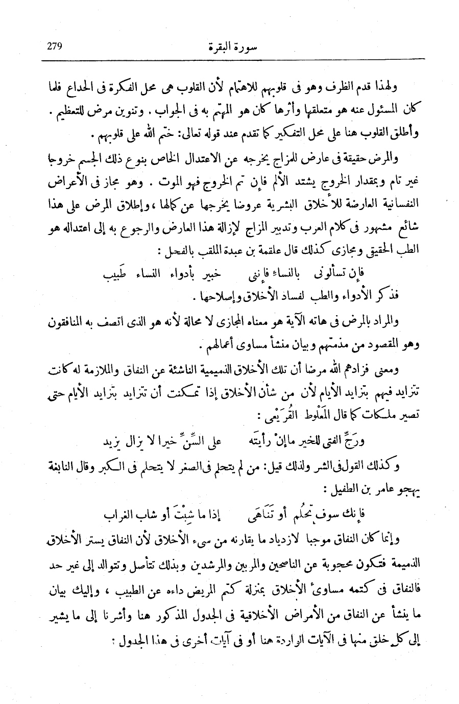 وَمَعْنَى فَزادَهُمُ اللَّهُ مَرَضاً أَنَّ تِلْكَ الْأَخْلَاق الذميمة النَّاشِئَةَ عَنِ النِّفَاقِ وَالْمُلَازَمَةِ لَهُ كَانَتْ تَتَزَايَدُ فِيهِمْ بِتَزَايُدِ الْأَيَّامِ لِأَنَّ مِنْ شَأْنِ الْأَخْلَاقِ إِذَا تَمَكَّنَتْ أَنْ تَتَزَايَدَ بِتَزَايُدِ الْأَيَّامِ حَتَّى تَصِيرَ مَلِكَاتٍ كَمَا قَالَ الْمَعْلُوطُ الْقُرَيْعِيُّ: