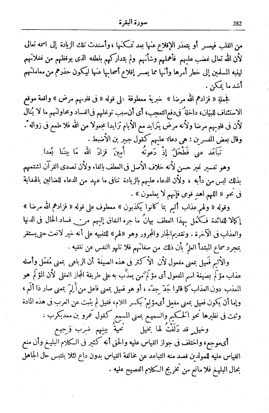 فَجُمْلَةُ: فَزادَهُمُ اللَّهُ مَرَضاً خَبَرِيَّةٌ مَعْطُوفَةٌ عَلَى قَوْلِهِ: فِي قُلُوبِهِمْ مَرَضٌ وَاقِعَةٌ مَوْقِعَ الِاسْتِئْنَافِ لِلْبَيَانِ، دَاخِلَةٌ فِي دَفْعِ التَّعَجُّبِ، أَيْ أَنَّ سَبَبَ تَوَغُّلِهِمْ فِي الْفَسَادِ وَمُحَاوَلَتِهِمْ مَا لَا يُنَالُ لِأَنَّ فِي قُلُوبِهِمْ مَرَضًا وَلِأَنَّهُ مَرَضٌ يَتَزَايَدُ مَعَ الْأَيَّامِ تَزَايُدًا مَجْعُولًا مِنَ اللَّهِ فَلَا طَمَعَ فِي زَوَالِهِ. وَقَالَ بَعْضُ الْمُفَسِّرِينَ: هِيَ دُعَاءٌ عَلَيْهِمْ كَقَوْلِ جُبَيْرِ بْنِ الْأَضْبَطِ: