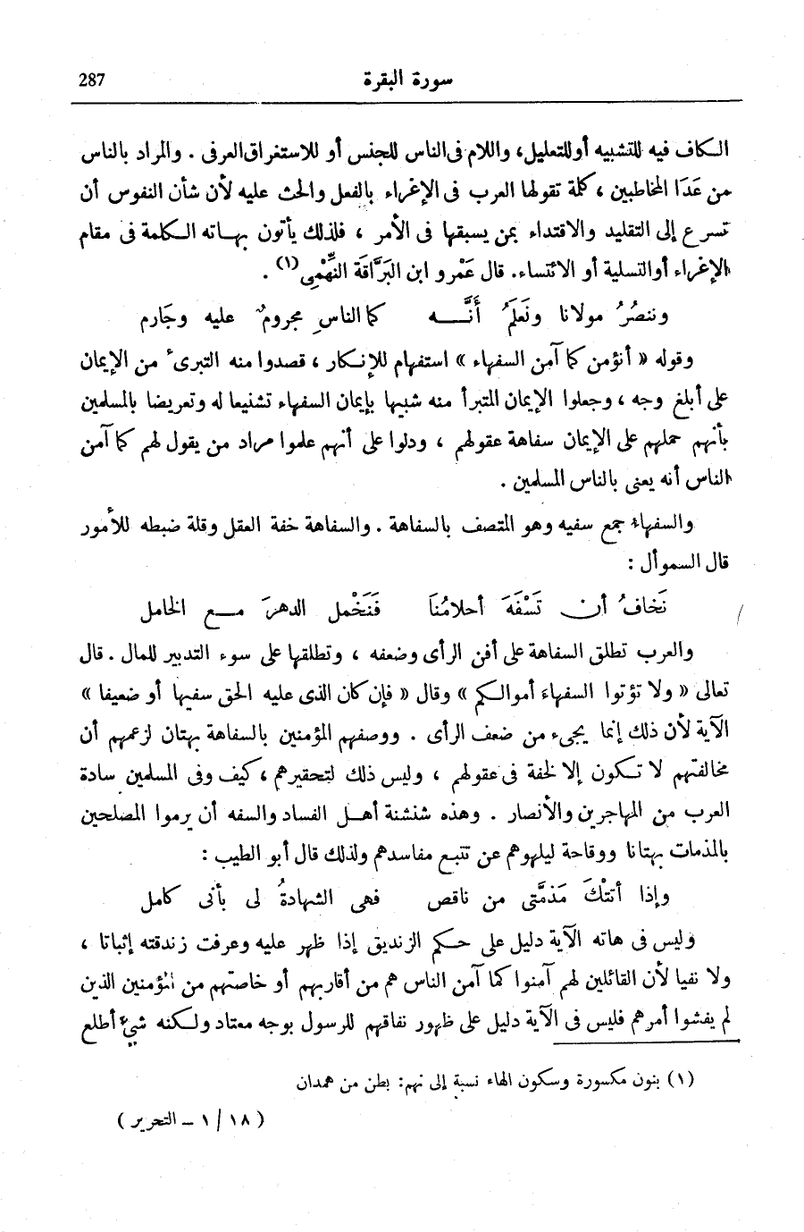 قَالَ تَعَالَى: وَلا تُؤْتُوا السُّفَهاءَ أَمْوالَكُمُ [النِّسَاء: 5] وَقَالَ: فَإِنْ كانَ الَّذِي عَلَيْهِ الْحَقُّ سَفِيهاً أَوْ ضَعِيفاً [الْبَقَرَة: 282] الْآيَةَ لِأَنَّ ذَلِكَ إِنَّمَا يَجِيءُ مِنْ ضَعْفِ الرَّأْيِ. وَوَصْفُهُمُ الْمُؤْمِنِينَ بِالسَّفَاهَةِ بُهْتَانٌ لِزَعْمِهِمْ أَنَّ مُخَالَفَتَهُمْ لَا تَكُونُ إِلَّا لِخِفَّةٍ فِي عُقُولِهِمْ، وَلَيْسَ ذَلِكَ لِتَحْقِيرِهِمْ، كَيْفَ وَفِي الْمُسْلِمِينَ سَادَةُ الْعَرَبِ مِنَ الْمُهَاجِرِينَ وَالْأَنْصَارِ. وَهَذِهِ شَنْشَنَةُ أَهْلِ الْفَسَادِ وَالسَّفَهِ أَنْ يَرْمُوا المصلحين بالمذمات يهتانا وَوَقَاحَةً لِيُلْهُوهُمْ عَنْ تَتَبُّعِ مَفَاسِدِهِمْ وَلِذَلِكَ قَالَ أَبُو الطَّيِّبِ: