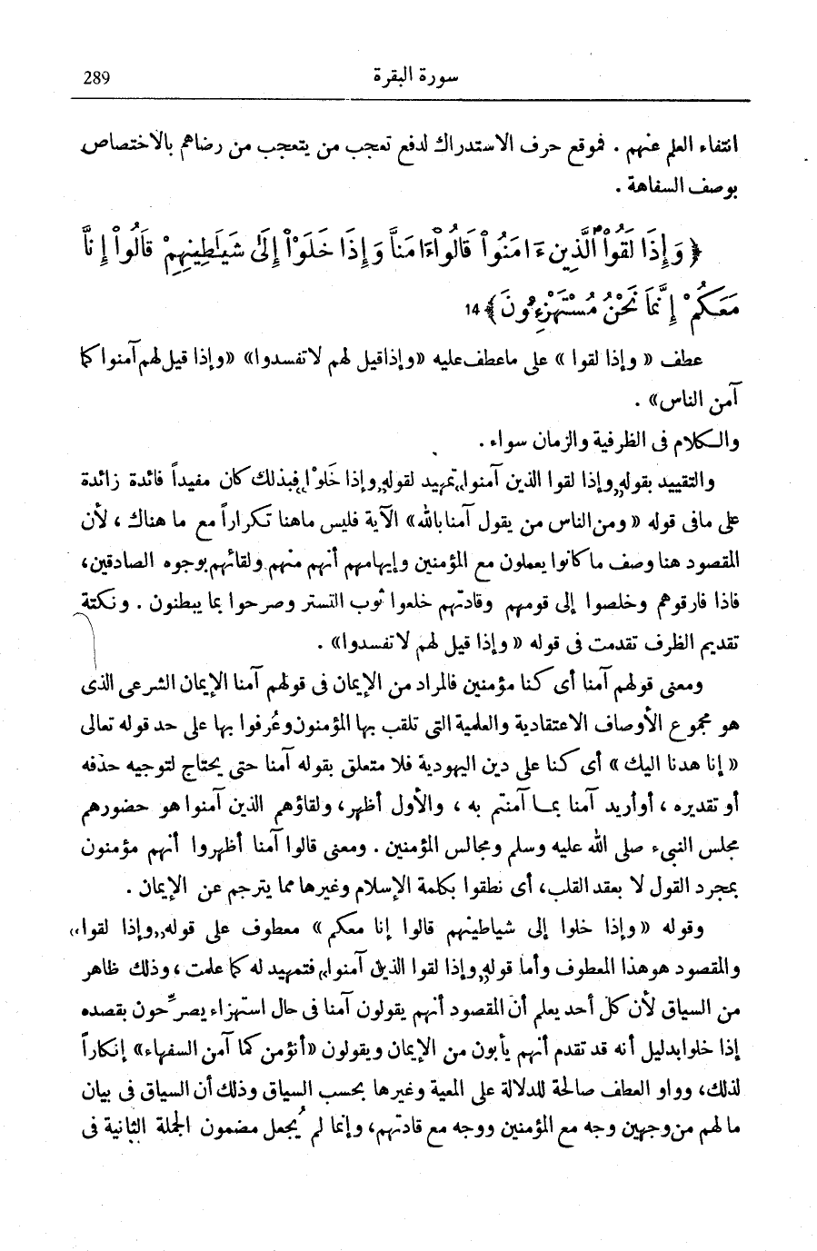 وَقَوْلُهُ: وَإِذا خَلَوْا إِلى شَياطِينِهِمْ قالُوا إِنَّا مَعَكُمْ مَعْطُوفٌ عَلَى قَوْلِهِ: وَإِذا لَقُوا وَالْمَقْصُودُ هُوَ هَذَا الْمَعْطُوفُ وَأَمَّا قَوْلُهُ: وَإِذا لَقُوا الَّذِينَ آمَنُوا فَتَمْهِيدٌ لَهُ كَمَا عَلِمْتَ، وَذَلِكَ ظَاهِرٌ مِنَ السِّيَاقِ لِأَنَّ كُلَّ أَحَدٍ يَعْلَمُ أَنَّ الْمَقْصُودَ أَنَّهُمْ يَقُولُونَ آمَنَّا فِي حَالِ اسْتِهْزَاءٍ يُصَرِّحُونَ بِقَصْدِهِ إِذَا خَلَوْا بِدَلِيلِ أَنَّهُ قَدْ تَقَدَّمَ أَنَّهُمْ يَأْبَوْنَ مِنَ الْإِيمَانِ وَيَقُولُونَ: أَنُؤْمِنُ كَما آمَنَ السُّفَهاءُ [الْبَقَرَة: 13] إِنْكَارًا لِذَلِكَ، وَوَاوُ الْعَطْفِ صَالِحَةٌ لِلدَّلَالَةِ عَلَى الْمَعِيَّةِ وَغَيْرِهَا بِحَسَبَ السِّيَاقِ وَذَلِكَ أَنَّ السِّيَاقَ فِي بَيَانِ مَا لَهُمْ مِنْ وَجْهَيْنِ وَجْهٍ مَعَ الْمُؤْمِنِينَ وَوَجْهٍ مَعَ قَادَتِهِمْ، وَإِنَّمَا لَمْ يَجْعَلْ مَضْمُونَ الْجُمْلَةِ الثَّانِيَةِ فِي