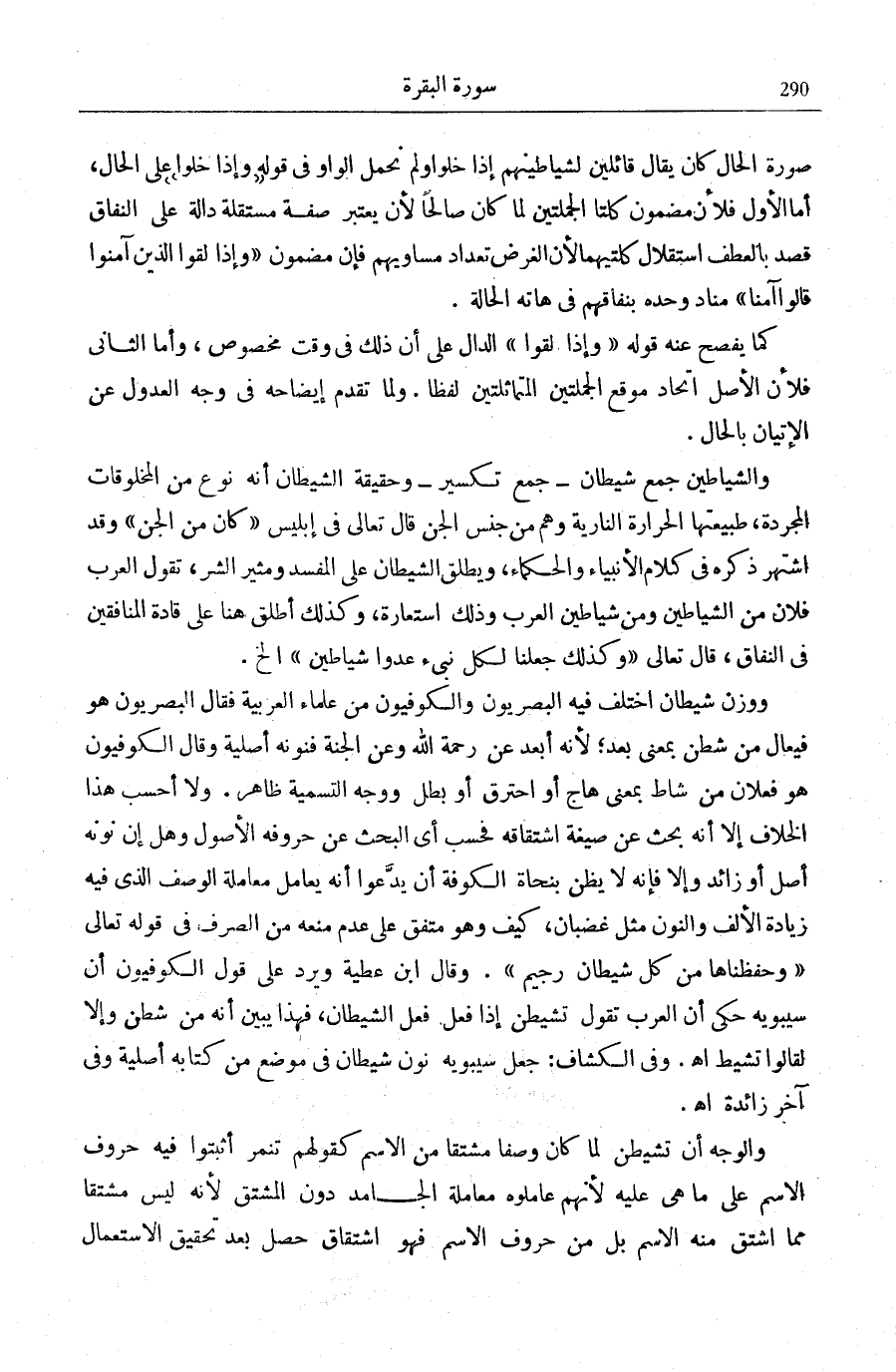 وَالْوَجْهُ أَنَّ تَشَيْطَنَ لَمَّا كَانَ وَصْفًا مُشْتَقًّا مِنَ الِاسْمِ كَقَوْلِهِمْ تَنَمَّرَ أَثْبَتُوا فِيهِ حُرُوفَ الِاسْمِ عَلَى مَا هِيَ عَلَيْهِ لِأَنَّهُمْ عَامَلُوهُ مُعَامَلَةَ الْجَامِدِ دُونَ الْمُشْتَقِّ لِأَنَّهُ لَيْسَ مُشْتَقًّا مِمَّا اشْتُقَّ مِنْهُ الِاسْمُ بَلْ مِنْ حُرُوفِ الِاسْمِ فَهُوَ اشْتِقَاقٌ حَصَلَ بَعْدَ تَحْقِيقِ الِاسْتِعْمَالِ