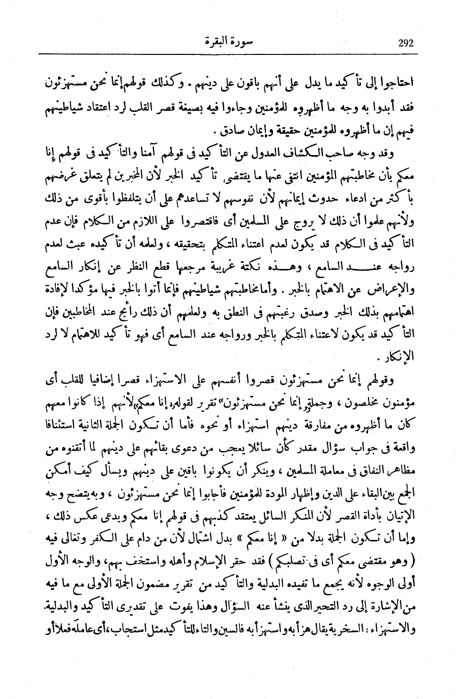 وَقَوْلُهُمْ: إِنَّما نَحْنُ مُسْتَهْزِؤُنَ قَصَرُوا أَنْفُسَهُمْ عَلَى الِاسْتِهْزَاءِ قَصْرًا إِضَافِيًّا لِلْقَلْبِ أَيْ مُؤْمِنُونَ مُخْلِصُونَ، وَجُمْلَةُ: إِنَّما نَحْنُ مُسْتَهْزِؤُنَ تَقْرِيرٌ لِقَوْلِهِ: إِنَّا مَعَكُمْ لِأَنَّهُمْ إِذَا كَانُوا مَعَهُمْ كَانَ مَا أَظْهَرُوهُ مِنْ مُفَارَقَةِ دِينِهِمُ اسْتِهْزَاءً أَوْ نَحْوَهُ فَأَمَّا أَنْ تَكُونَ الْجُمْلَةُ الثَّانِيَةُ اسْتِئْنَافًا وَاقِعَةً فِي جَوَابِ سُؤَالٍ مُقَدَّرٍ كَأَنَّ سَائِلًا يَعْجَبُ مِنْ دَعْوَى بَقَائِهِمْ عَلَى دِينِهِمْ لِمَا أَتْقَنُوهُ مِنْ مَظَاهِرِ النِّفَاقِ فِي مُعَامَلَةِ الْمُسْلِمِينَ، وَيُنْكِرُ أَنْ يَكُونُوا بَاقِينَ عَلَى دِينِهِمْ وَيَسْأَلُ كَيْفَ أَمْكَنَ الْجَمْعُ بَيْنَ الْبَقَاءِ عَلَى الدِّينِ وَإِظْهَارِ الْمَوَدَّةِ لِلْمُؤْمِنِينَ فَأَجَابُوا إِنَّما نَحْنُ مُسْتَهْزِؤُنَ، وَبِهِ يَتَّضِحُ وَجْهُ الْإِتْيَانِ بِأَدَاةِ الْقَصْرِ لِأَنَّ الْمُنْكِرَ السَّائِلَ يَعْتَقِدُ كَذِبَهُمْ فِي قَوْلِهِمْ إِنَّا مَعَكُمْ وَيَدَّعِي عَكْسَ ذَلِكَ، وَإِمَّا أَنْ تَكُونَ الْجُمْلَةُ بَدَلًا مِنْ إِنَّا مَعَكُمْ بَدَلَ اشْتِمَالٍ لِأَنَّ مَنْ دَامَ عَلَى الْكُفْرِ وَتَغَالَى فِيهِ- وَهُوَ مُقْتَضَى مَعَكُمْ أَيْ فِي تَصَلُّبِكُمْ- فَقَدْ حَقَّرَ الْإِسْلَامَ وَأَهْلَهُ وَاسْتَخَفَّ بِهِمْ، وَالْوَجْهُ الْأَوَّلُ أَوْلَى الْوُجُوهِ لِأَنَّهُ يَجْمَعُ مَا تُفِيدُهُ الْبَدَلِيَّةُ وَالتَّأْكِيدُ مِنْ تَقْرِيرِ مَضْمُونِ الْجُمْلَةِ الْأُولَى مَعَ مَا فِيهِ مِنَ الْإِشَارَةِ إِلَى رَدِّ التَّحَيُّرِ الَّذِي يَنْشَأُ عَنْهُ السُّؤَالُ وَهَذَا يَفُوتُ عَلَى تَقْدِيرَيِ التَّأْكِيدِ وَالْبَدَلِيَّةِ.