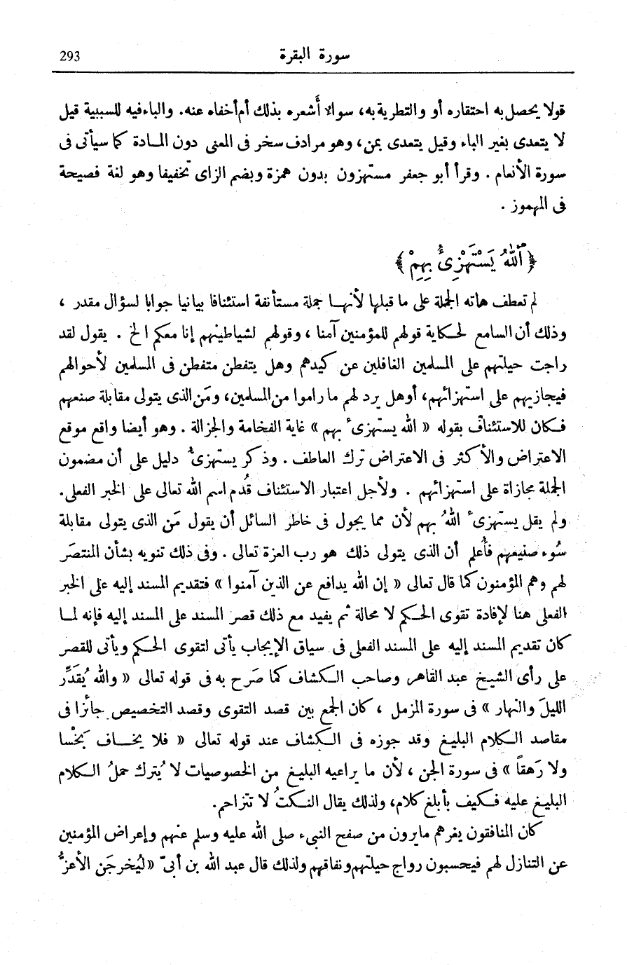 وَلِأَجَلِ اعْتِبَارِ الِاسْتِئْنَافِ قُدِّمَ اسْمُ اللَّهِ تَعَالَى عَلَى الْخَبَرِ الْفِعْلِيِّ. وَلم يقل يستهزىء اللَّهُ بِهِمْ لِأَنَّ مِمَّا يَجُولُ فِي خَاطِرِ السَّائِلِ أَنْ يَقُولَ مَنِ الَّذِي يَتَوَلَّى مُقَابَلَةَ سُوءِ صَنِيعِهِمْ فَأُعْلِمَ أَنَّ الَّذِي يَتَوَلَّى ذَلِكَ هُوَ رَبُّ الْعِزَّةِ تَعَالَى، وَفِي ذَلِكَ تَنْوِيهٌ بِشَأْنِ الْمُنْتَصِرِ لَهُمْ وَهُمُ الْمُؤْمِنُونَ كَمَا قَالَ تَعَالَى: إِنَّ اللَّهَ يُدافِعُ عَنِ الَّذِينَ آمَنُوا [الْحَج: 38] فَتَقْدِيمُ الْمُسْنَدِ إِلَيْهِ عَلَى الْخَبَرِ الْفِعْلِيِّ هُنَا لِإِفَادَةِ تَقَوِّي الْحُكْمِ لَا مَحَالَةَ ثُمَّ يُفِيدُ مَعَ ذَلِكَ قَصْرُ الْمُسْنَدِ عَلَى الْمُسْنَدِ إِلَيْهِ فَإِنَّهُ لَمَّا كَانَ تَقْدِيمُ الْمُسْنَدِ إِلَيْهِ عَلَى الْمُسْنَدِ الْفِعْلِيِّ فِي سِيَاقِ الْإِيجَابِ يَأْتِي لِتَقَوِّي الْحُكْمِ وَيَأْتِي لِلْقَصْرِ عَلَى رَأْيِ الشَّيْخِ عَبْدِ الْقَاهِرِ وَصَاحِبِ «الْكَشَّافِ» كَمَا صَرَّحَ بِهِ فِي قَوْلِهِ تَعَالَى: وَاللَّهُ يُقَدِّرُ اللَّيْلَ وَالنَّهارَ فِي سُورَةِ الْمُزَّمِّلِ [20] ، كَانَ الْجَمْعُ بَيْنَ قَصْدِ التَّقَوِّي وَقَصْدِ التَّخْصِيصِ جَائِزًا فِي مَقَاصِدِ الْكَلَامِ الْبَلِيغِ وَقَدْ جَوَّزَهُ فِي «الْكَشَّافِ» عِنْدَ قَوْلِهِ تَعَالَى: فَلا يَخافُ بَخْساً وَلا رَهَقاً فِي سُورَةِ الْجِنِّ [13] ، لِأَنَّ مَا يُرَاعِيهِ الْبَلِيغُ مِنَ الْخُصُوصِيَّاتِ لَا يَتْرُكُ حَمْلَ الْكَلَامِ الْبَلِيغِ عَلَيْهِ فَكَيْفَ بِأَبْلَغِ كَلَامٍ، وَلِذَلِكَ يُقَالُ النُّكَتُ لَا تَتَزَاحَمُ.