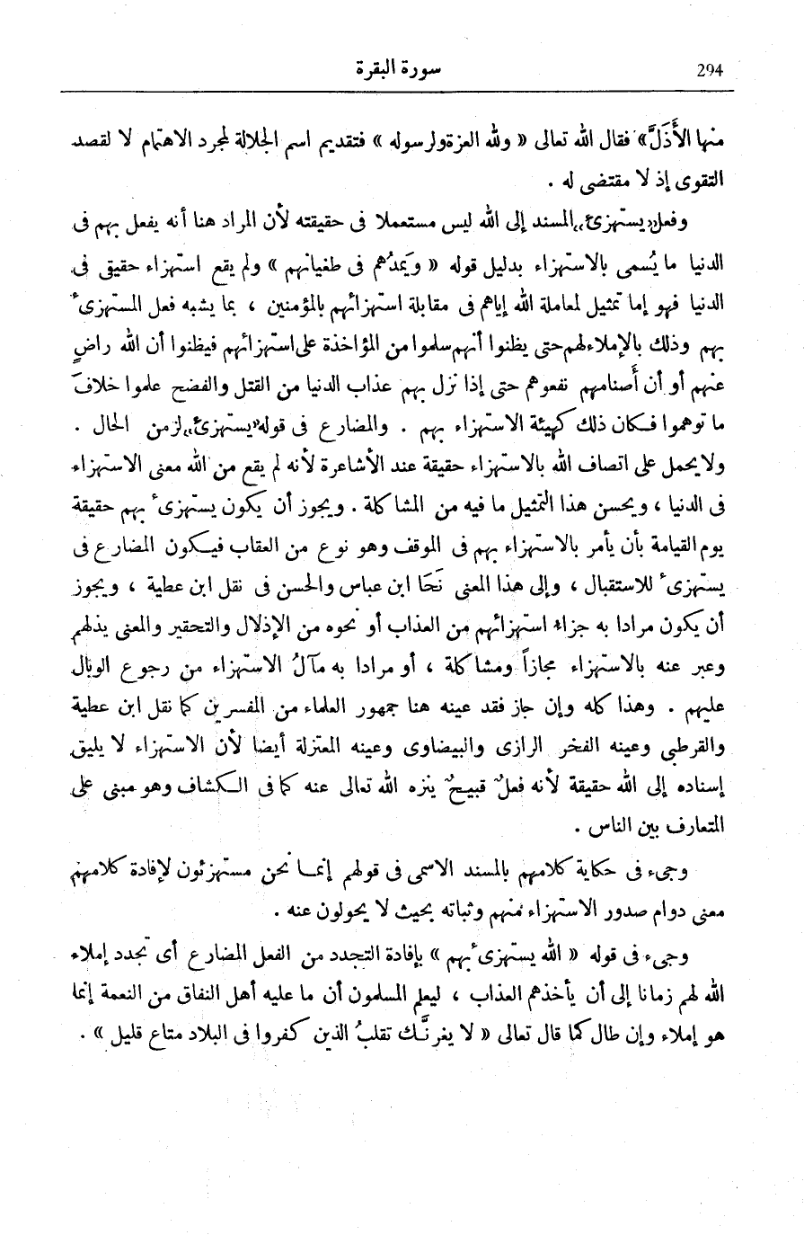 وَلَا يُحْمَلُ عَلَى اتِّصَافِ اللَّهِ بِالِاسْتِهْزَاءِ حَقِيقَةً عِنْدَ الْأَشَاعِرَةِ لِأَنَّهُ لَمْ يَقَعْ مِنَ اللَّهِ مَعْنَى الِاسْتِهْزَاءِ فِي الدُّنْيَا، وَيُحَسِّنُ هَذَا التَّمْثِيلَ مَا فِيهِ مِنَ الْمُشَاكَلَةِ. وَيَجُوزُ أَنْ يَكُونَ يَسْتَهْزِئُ بِهِمْ حَقِيقَةً يَوْمَ الْقِيَامَةِ بِأَنْ يَأْمُرَ بِالِاسْتِهْزَاءِ بِهِمْ فِي الْمَوْقِفِ وَهُوَ نَوْعٌ مِنَ الْعِقَابِ فَيَكُونُ الْمُضَارِعُ فِي يَسْتَهْزِئُ لِلِاسْتِقْبَالِ، وَإِلَى هَذَا الْمَعْنَى نَحَا ابْنُ عَبَّاسٍ وَالْحَسَنُ فِي نَقْلِ ابْنِ عَطِيَّةَ، وَيَجُوزُ أَنْ يَكُونَ مُرَادًا بِهِ جَزَاءُ اسْتِهْزَائِهِمْ مِنَ الْعَذَابِ أَوْ نَحْوِهِ مِنَ الْإِذْلَالِ وَالتَّحْقِيرِ وَالْمَعْنَى يُذِلُّهُمْ وَعَبَّرَ عَنْهُ بِالِاسْتِهْزَاءِ مَجَازًا وَمُشَاكَلَةً، أَوْ مُرَادًا بِهِ مَآلُ الِاسْتِهْزَاءِ مِنْ رُجُوعِ الْوَبَالِ عَلَيْهِمْ. وَهَذَا كُلُّهُ وَإِنْ جَازَ فَقَدْ عَيَّنَهُ هُنَا جُمْهُورُ الْعُلَمَاءِ مِنَ الْمُفَسِّرِينَ كَمَا نَقَلَ ابْنُ عَطِيَّةَ وَالْقُرْطُبِيُّ وَعَيَّنَهُ الْفَخْرُ الرَّازِيُّ وَالْبَيْضَاوِيُّ وَعَيَّنَهُ الْمُعْتَزِلَةُ أَيْضًا لِأَنَّ الِاسْتِهْزَاءَ لَا يَلِيقُ إِسْنَادُهُ إِلَى اللَّهِ حَقِيقَةً لِأَنَّهُ فِعْلٌ قَبِيحٌ يُنَزَّهُ اللَّهَ تَعَالَى عَنْهُ كَمَا فِي «الْكَشَّافِ» وَهُوَ مَبْنِيٌّ عَلَى الْمُتَعَارَفِ بَيْنَ النَّاسِ.