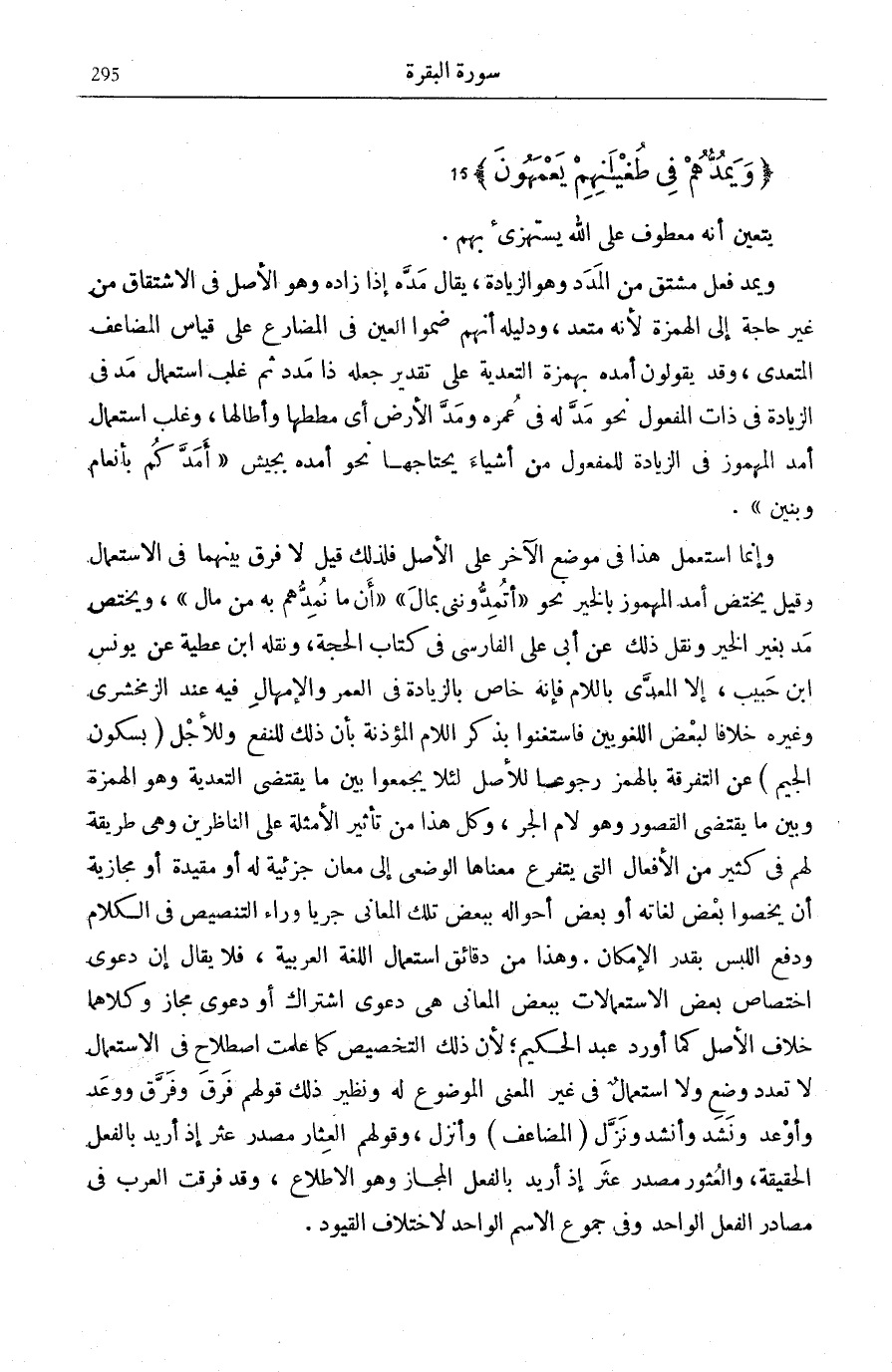الِاشْتِقَاقِ مِنْ غَيْرِ حَاجَةٍ إِلَى الْهَمْزَةِ لِأَنَّهُ مُتَعَدٍّ، وَدَلِيلُهُ أَنَّهُمْ ضَمُّوا الْعَيْنَ فِي الْمُضَارِعِ عَلَى قِيَاسِ الْمُضَاعَفِ الْمُتَعَدِّي، وَقَدْ يَقُولُونَ أَمَدَّهُ بِهَمْزَةِ التَّعْدِيَةِ عَلَى تَقْدِيرِ جَعَلَهُ ذَا مَدَدٍ ثُمَّ غَلَبَ اسْتِعْمَالُ مَدَّ فِي الزِّيَادَةِ فِي ذَاتِ الْمَفْعُولِ نَحْوُ مَدَّ لَهُ فِي عُمُرِهِ وَمَدَّ الْأَرْضَ أَيْ مَطَّطَهَا وَأَطَالَهَا، وَغَلَبَ اسْتِعْمَالُ أَمَدَّ الْمَهْمُوزِ فِي الزِّيَادَةِ لِلْمَفْعُولِ مِنْ أَشْيَاءَ يَحْتَاجُهَا نَحْوُ أَمَدَّهُ بِجَيْشٍ: أَمَدَّكُمْ بِأَنْعامٍ وَبَنِينَ [الشُّعَرَاء: 133] . وَإِنَّمَا اسْتُعْمِلَ هَذَا فِي مَوْضِعِ الْآخَرِ عَلَى الْأَصْلِ فَلِذَلِكَ قِيلَ لَا فَرْقَ بَيْنَهُمَا فِي الِاسْتِعْمَالِ وَقِيلَ يَخْتَصُّ أَمَدَّ الْمَهْمُوزُ بِالْخَيرِ نَحْو: أَتُمِدُّونَنِ بِمالٍ [النَّمْل: 36] أَنَّما نُمِدُّهُمْ بِهِ مِنْ مالٍ [الْمُؤْمِنُونَ: 55] ، وَيَخْتَصُّ مَدَّ بِغَيْرِ الْخَيْرِ وَنُقِلَ ذَلِكَ عَنْ أَبِي عَلِيٍّ الْفَارِسِيِّ فِي كِتَابِ «الْحُجَّةِ» ، وَنَقَلَهُ ابْنُ عَطِيَّةَ عَنْ يُونُسَ بْنِ حَبِيبٍ، إِلَّا الْمُعَدَّى بِاللَّامِ فَإِنَّهُ خَاصٌّ بِالزِّيَادَةِ فِي الْعُمُرِ وَالْإِمْهَالِ فِيهِ عِنْدَ الزَّمَخْشَرِيِّ وَغَيْرِهِ خِلَافًا لِبَعْضِ اللُّغَوِيِّينَ فَاسْتَغْنَوْا بِذِكْرِ اللَّامِ الْمُؤْذِنَةِ بِأَنَّ ذَلِكَ لِلنَّفْعِ وَلِلْأَجَلِ (بِسُكُونِ الْجِيمِ) عَنِ التَّفْرِقَةِ بِالْهَمْزِ رُجُوعًا لِلْأَصْلِ لِئَلَّا يَجْمَعُوا بَيْنَ مَا يَقْتَضِي التَّعْدِيَةَ وَهُوَ الْهَمْزَةُ وَبَيْنَ مَا يَقْتَضِي الْقُصُورَ وَهُوَ لَامُ الْجَرِّ، وَكُلُّ هَذَا مِنْ تَأْثِيرِ الْأَمْثِلَةِ عَلَى النَّاظِرِينَ وَهِيَ طَرِيقَةٌ لَهُمْ فِي كَثِيرٍ مِنَ الْأَفْعَالِ الَّتِي يَتَفَرَّعُ مَعْنَاهَا الْوَضْعِيُّ إِلَى مَعَانٍ جُزْئِيَّةٍ لَهُ أَوْ مُقَيَّدَةٍ أَوْ مَجَازِيَّةٍ أَنْ يَخُصُّوا بَعْضَ لُغَاتِهِ أَوْ بَعْضَ أَحْوَالِهِ بِبَعْضِ تِلْكَ الْمَعَانِي جَرْيًا وَرَاءَ التَّنْصِيصِ فِي الْكَلَامِ وَدَفْعِ اللَّبْسِ بِقَدْرِ الْإِمْكَانِ. وَهَذَا مِنْ دَقَائِقِ اسْتِعْمَالِ اللُّغَةِ الْعَرَبِيَّةِ، فَلَا يُقَالُ إِنَّ دَعْوَى اخْتِصَاصِ بَعْضِ الِاسْتِعْمَالَاتِ بِبَعْضِ الْمَعَانِي هِيَ دَعْوَى اشْتِرَاكٍ أَوْ دَعْوَى مَجَازٍ وَكِلَاهُمَا خِلَافُ الْأَصْلِ كَمَا أَوْرَدَ عَبْدُ الْحَكِيمِ لِأَنَّ ذَلِكَ التَّخْصِيصَ كَمَا عَلِمْتَ اصْطِلَاحٌ فِي الِاسْتِعْمَالِ لَا تَعَدُّدُ وَضْعٍ وَلَا اسْتِعْمَالٌ فِي غَيْرِ الْمَعْنَى الْمَوْضُوعِ لَهُ وَنَظِيرُ ذَلِكَ قَوْلُهُمْ فَرَقَ وَفَرَّقَ وَوَعَدَ وَأَوْعَدَ وَنَشَدَ وَأَنْشَدَ وَنَزَّلَ (الْمُضَاعَفُ) وَأَنْزَلَ، وَقَوْلُهُمِ الْعِثَارُ مَصْدَرُ عَثَرَ إِذْ أُرِيدَ بِالْفِعْلِ الْحَقِيقَةُ، وَالْعُثُورُ مَصْدَرُ عَثَرَ إِذْ أُرِيدَ بِالْفِعْلِ الْمَجَازُ وَهُوَ الِاطِّلَاعُ، وَقَدْ فَرَّقَتِ الْعَرَبُ فِي مَصَادِرِ الْفِعْلِ الْوَاحِدِ وَفِي جُمُوعِ الِاسْمِ الْوَاحِدِ لِاخْتِلَافِ الْقُيُودِ.