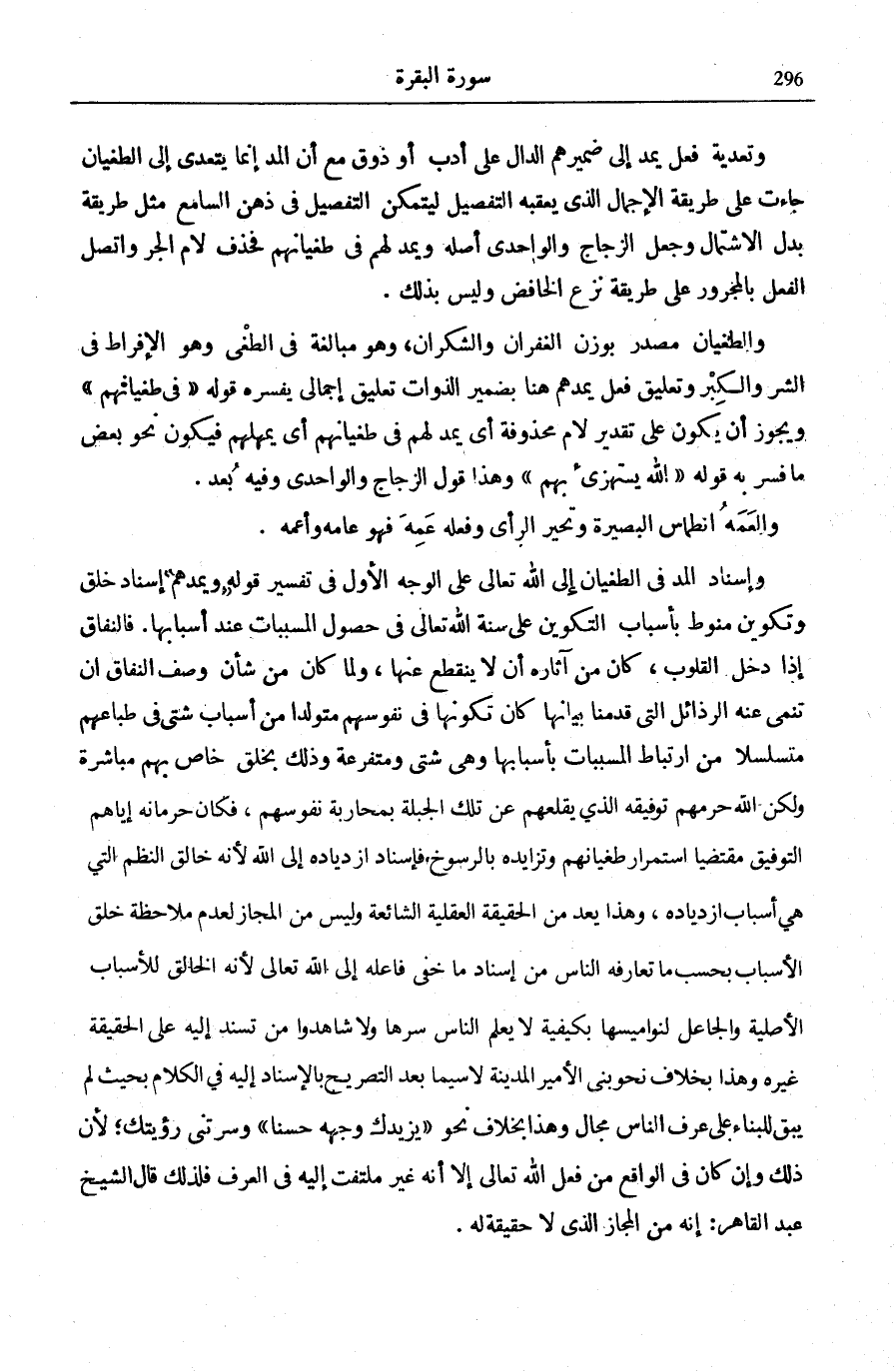 وَتَعْدِيَةُ فِعْلِ (يَمُدُّ) إِلَى ضَمِيرِهِمُ الدَّالِّ عَلَى أَدَبٍ أَوْ ذَوْقٍ مَعَ أَنَّ الْمَدَّ إِنَّمَا يَتَعَدَّى إِلَى الطُّغْيَانِ جَاءَتْ عَلَى طَرِيقَةِ الْإِجْمَالِ الَّذِي يَعْقُبُهُ التَّفْصِيلُ لِيَتَمَكَّنَ التَّفْصِيلُ فِي ذِهْنِ السَّامِعِ مِثْلُ طَرِيقَةِ بَدَلِ الِاشْتِمَالِ وَجَعَلَ الزَّجَّاجُ وَالْوَاحِدِيُّ أَصْلَهُ وَيَمُدُّ لَهُمْ فِي طُغْيَانِهِمْ فَحَذَفَ لَامَ الْجَرِّ وَاتَّصَلَ الْفِعْلُ بِالْمَجْرُورِ عَلَى طَرِيقَةِ نَزْعِ الْخَافِضِ وَلَيْسَ بِذَلِكَ.