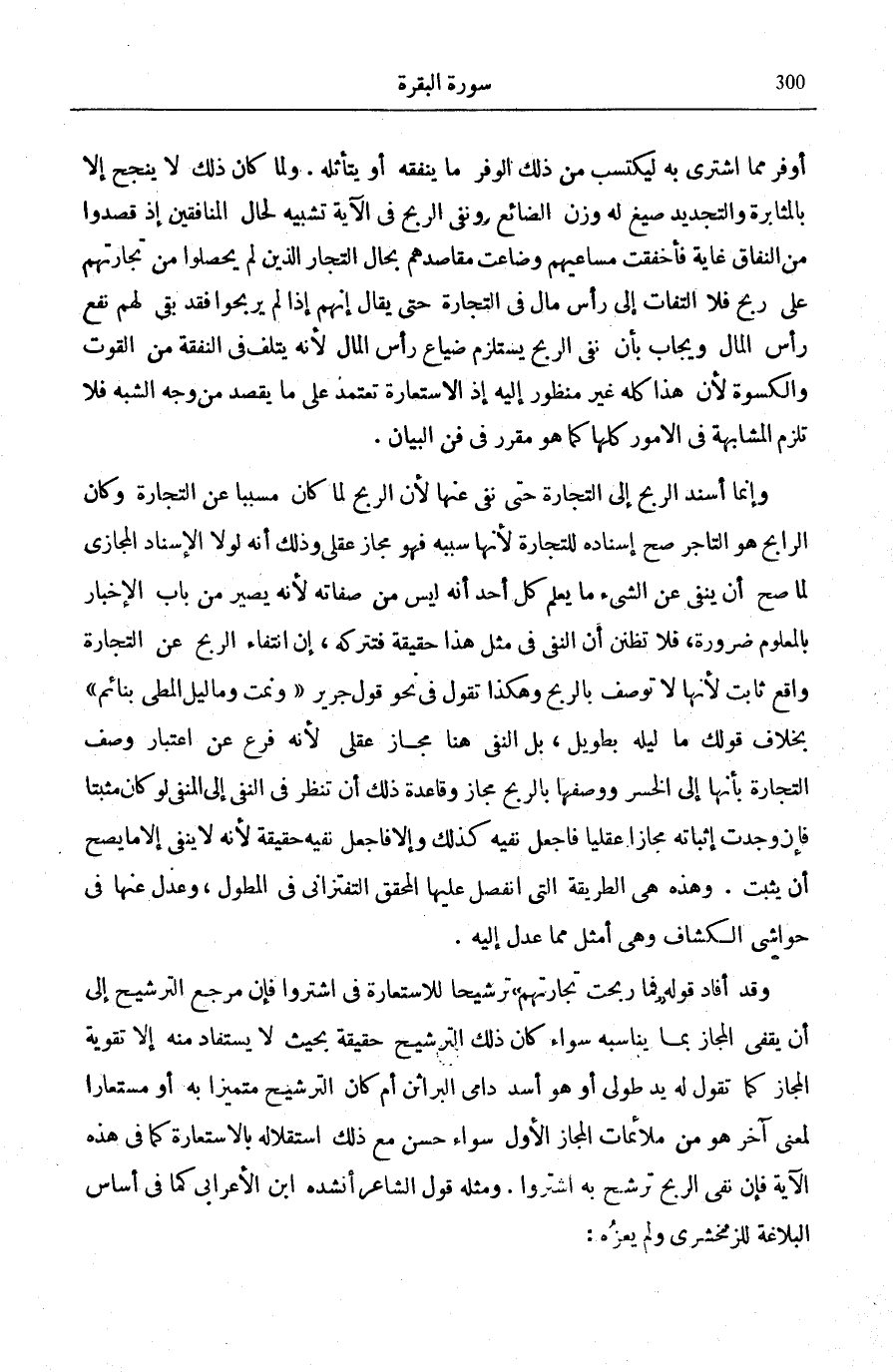 الْإِسْنَادُ الْمَجَازِيُّ لَمَا صَحَّ أَنْ يُنْفَى عَنِ الشَّيْءِ مَا يَعْلَمُ كُلُّ أَحَدٍ أَنَّهُ لَيْسَ مِنْ صِفَاتِهِ لِأَنَّهُ يَصِيرُ مِنْ بَابِ الْإِخْبَارِ بِالْمَعْلُومِ ضَرُورَةً، فَلَا تَظُنَّنَّ أَنَّ النَّفْيَ فِي مِثْلِ هَذَا حَقِيقَةٌ فَتَتْرُكَهُ، إِنَّ انْتِفَاءَ الرِّبْحِ عَنِ التِّجَارَةِ وَاقِعٌ ثَابِتٌ لِأَنَّهَا لَا تُوصَفُ بِالرِّبْحِ وَهَكَذَا تَقُولُ فِي نَحْوِ قَوْلِ جَرِيرٍ: