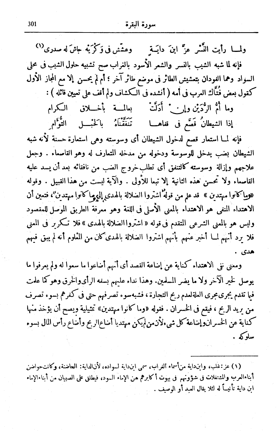 (¬1) عز: غلب، وَابْن داية من أَسمَاء الْغُرَاب، سمي ابْن داية لسواده، لِأَن الداية: الحاضنة، وَكَانَت حواضن أَبنَاء الْعَرَب والمشتغلات فِي شؤونهم فِي بيُوت أكابرهم هن الْإِمَاء السود، فيطلق على الصّبيان من أَبنَاء الْإِمَاء ابْن داية تأنيسا لَهُ لِئَلَّا يُقَال العَبْد أَو الوصيف.