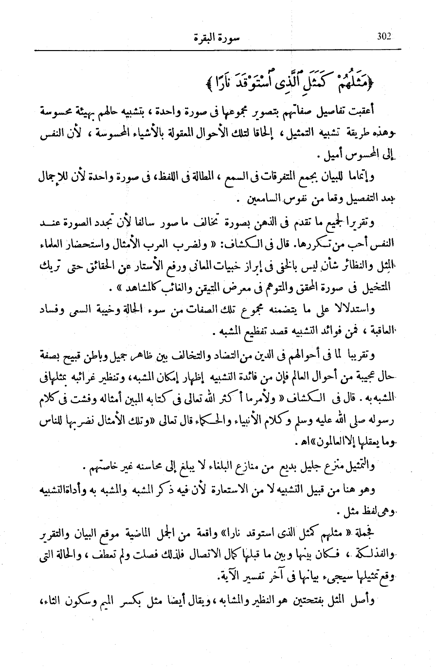 وَالتَّمْثِيلُ مَنْزَعٌ جَلِيلٌ بَدِيعٌ مِنْ مَنَازِعِ الْبُلَغَاءِ لَا يَبْلُغُ إِلَى مَحَاسِنِهِ غَيْرُ خَاصَّتِهِمْ. وَهُوَ هُنَا مِنْ قَبِيلِ التَّشْبِيهِ لَا مِنَ الِاسْتِعَارَةِ لِأَنَّ فِيهِ ذِكْرَ الْمُشَبَّهِ وَالْمُشَبَّهِ بِهِ وَأَدَاةِ التَّشْبِيهِ وَهِيَ لَفْظُ مَثَلٍ. فَجُمْلَةُ: مَثَلُهُمْ كَمَثَلِ الَّذِي اسْتَوْقَدَ نَارًا وَاقِعَةٌ مِنَ الْجُمَلِ الْمَاضِيَةِ مَوْقِعَ الْبَيَانِ وَالتَّقْرِيرِ وَالْفَذْلَكَةِ، فَكَانَ بَيْنَهَا وَبَيْنَ مَا قَبْلَهَا كَمَالُ الِاتِّصَالِ فَلِذَلِكَ فُصِلَتْ وَلَمْ تُعْطَفْ، وَالْحَالَةُ الَّتِي وَقع تمثيلها سيجيئ بَيَانُهَا فِي آخِرِ تَفْسِيرِ الْآيَةِ.
