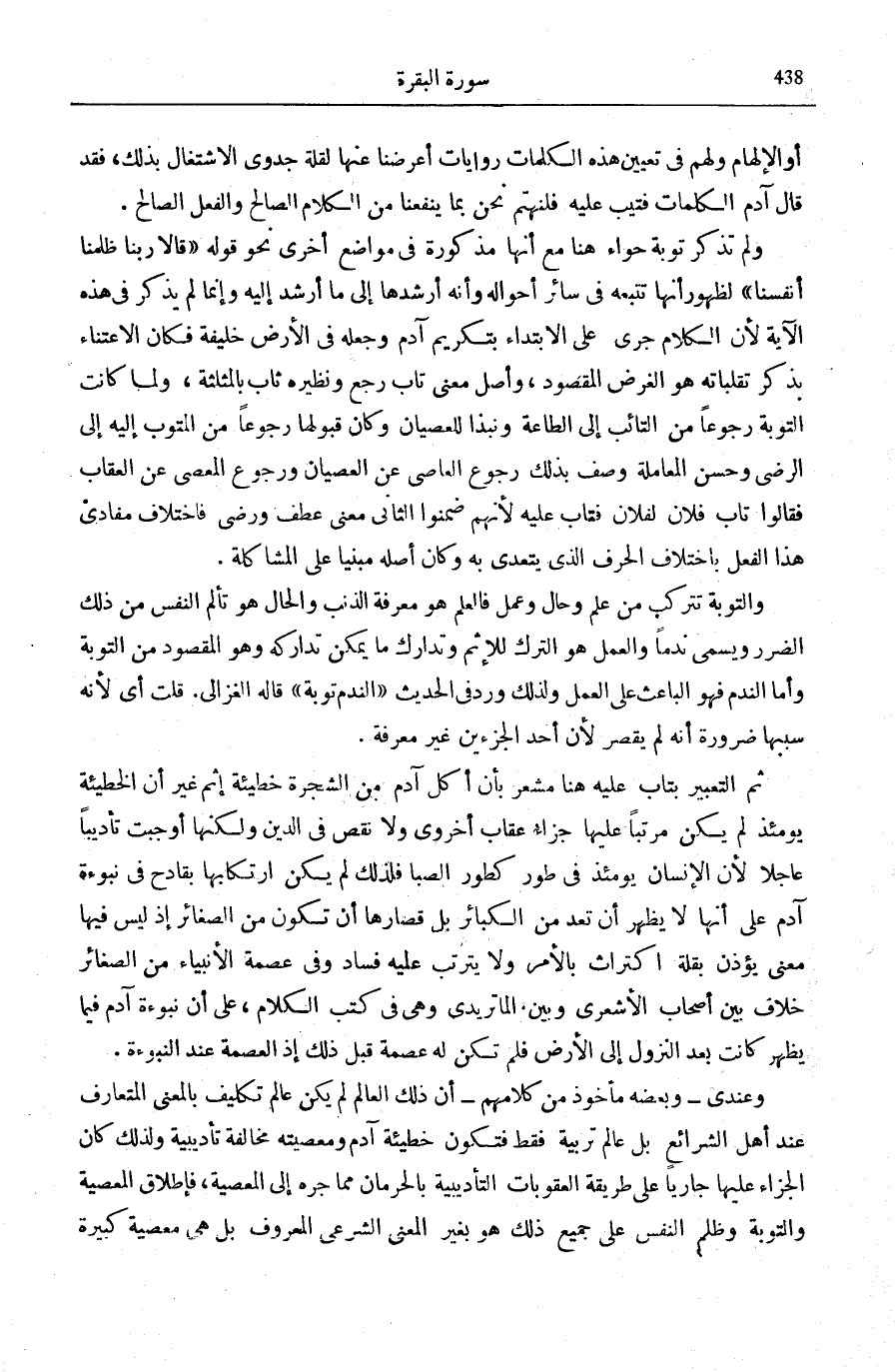 أَوِ الْإِلْهَامِ. وَلَهُمْ فِي تَعْيِينِ هَذِهِ الْكَلِمَاتِ رِوَايَاتٌ أَعْرَضْنَا عَنْهَا لِقِلَّةِ جَدْوَى الِاشْتِغَالِ بِذَلِكَ، فَقَدْ قَالَ آدَمُ الْكَلِمَاتِ فَتِيبَ عَلَيْهِ فَلْنَهْتَمَّ نَحْنُ بِمَا يَنْفَعُنَا مِنَ الْكَلَامِ الصَّالِحِ وَالْفِعْلِ الصَّالِحِ.