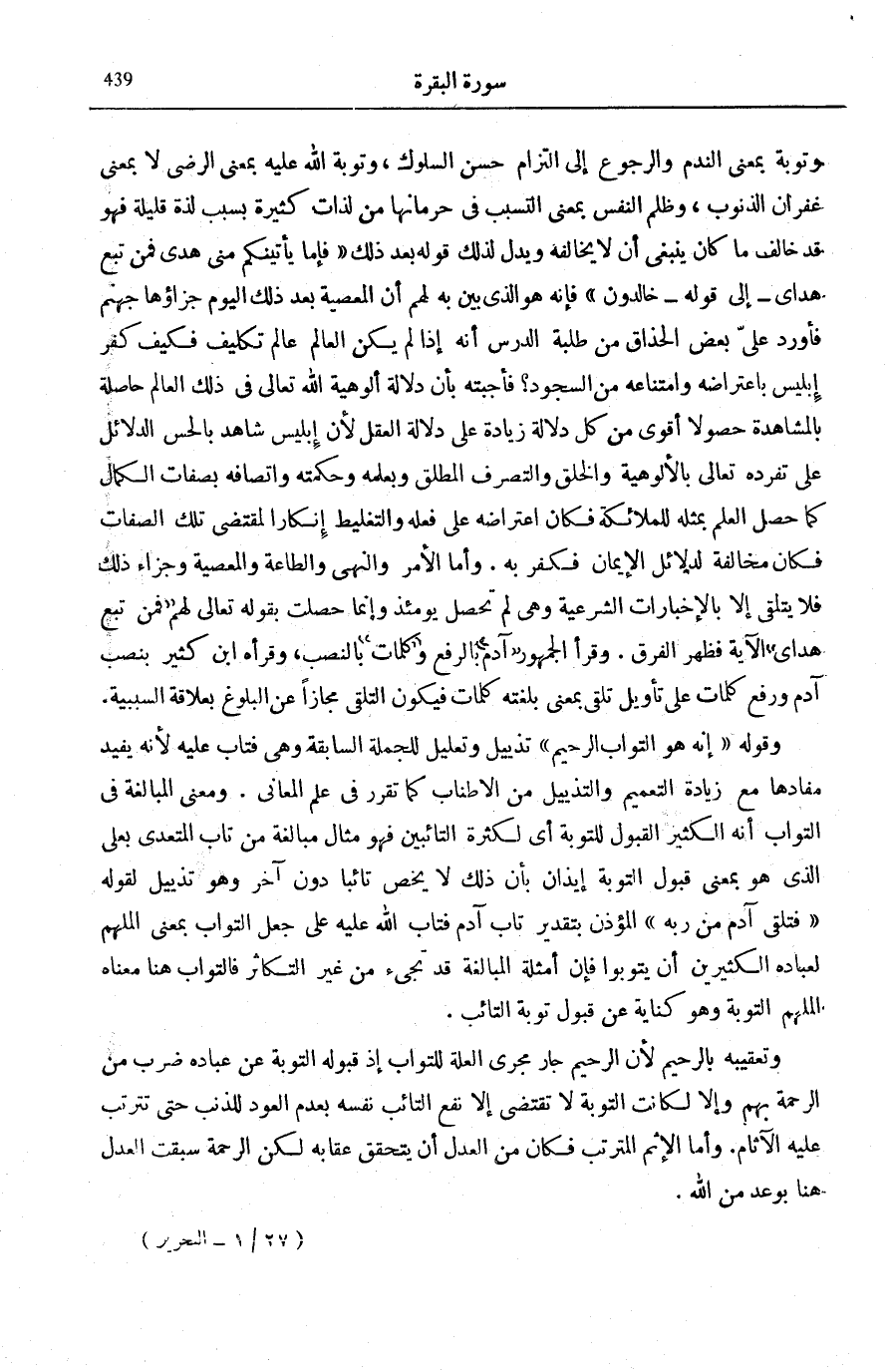 وَتَوْبَةٌ بِمَعْنَى النَّدَمِ وَالرُّجُوعِ إِلَى الْتِزَامِ حُسْنِ السُّلُوكِ، وَتَوْبَةُ اللَّهِ عَلَيْهِ بِمَعْنى الرضى لَا بِمَعْنَى غُفْرَانِ الذُّنُوبِ، وَظُلْمُ النَّفْسِ بِمَعْنَى التَّسَبُّبِ فِي حِرْمَانِهَا مِنْ لَذَّاتٍ كَثِيرَةٍ بِسَبَبِ لَذَّةٍ قَلِيلَةٍ فَهُوَ قَدْ خَالَفَ مَا كَانَ يَنْبَغِي أَنْ لَا يُخَالِفَهُ وَيَدُلُّ لِذَلِكَ قَوْلُهُ بَعْدَ ذَلِكَ: فَإِمَّا يَأْتِيَنَّكُمْ مِنِّي هُدىً فَمَنْ تَبِعَ هُدايَ إِلَى قَوْله خالِدُونَ [الْبَقَرَة: 38، 39] فَإِنَّهُ هُوَ الَّذِي بَيَّنَ بِهِ لَهُمْ أَنَّ الْمَعْصِيَةَ بَعْدَ ذَلِكَ الْيَوْمِ جَزَاؤُهَا جَهَنَّمُ فَأَوْرَدَ عَلَيَّ بَعْضُ الْحُذَّاقِ مِنْ طَلَبَةِ الدَّرْسِ أَنَّهُ إِذَا لَمْ يَكُنِ الْعَالَمُ عَالَمَ تَكْلِيفٍ فَكَيْفَ كَفَرَ إِبْلِيسُ بِاعْتِرَاضِهِ وَامْتِنَاعِهِ مِنَ السُّجُودِ؟ فَأَجَبْتُهُ بِأَنَّ دَلَالَةَ أُلُوهِيَّةِ اللَّهِ تَعَالَى فِي ذَلِكَ الْعَالَمِ حَاصِلَةٌ بِالْمُشَاهَدَةِ حُصُولًا أَقْوَى مِنْ كُلِّ دَلَالَةٍ زِيَادَةً عَلَى دَلَالَةِ الْعَقْلِ لِأَنَّ إِبْلِيسَ شَاهِدٌ بِالْحِسِّ الدَّلَائِلَ عَلَى تَفَرُّدِهِ تَعَالَى بِالْأُلُوهِيَّةِ وَالْخَلْقِ وَالتَّصَرُّفِ الْمُطْلَقِ وَبِعَلَمِهِ وَحِكْمَتِهِ وَاتِّصَافِهِ بِصِفَاتِ الْكَمَالِ كَمَا حَصَلَ الْعِلْمُ بِمِثْلِهِ لِلْمَلَائِكَةِ فَكَانَ اعْتِرَاضُهُ عَلَى فِعْلِهِ وَالتَّغْلِيطُ إِنْكَارًا لِمُقْتَضَى تِلْكَ الصِّفَاتِ فَكَانَ مُخَالَفَةً لِدَلَائِلِ الْإِيمَانِ فَكَفَرَ بِهِ. وَأَمَّا الْأَمْرُ وَالنَّهْيُ وَالطَّاعَةُ وَالْمَعْصِيَةُ وَجَزَاءُ ذَلِكَ فَلَا يُتَلَقَّى إِلَّا بِالْإِخْبَارَاتِ الشَّرْعِيَّةِ وَهِيَ لَمْ تَحْصُلْ يَوْمَئِذٍ وَإِنَّمَا حَصَلَتْ بِقَوْلِهِ تَعَالَى لَهُمْ: فَمَنْ تَبِعَ هُدايَ الْآيَةَ فَظَهَرَ الْفَرْقُ.