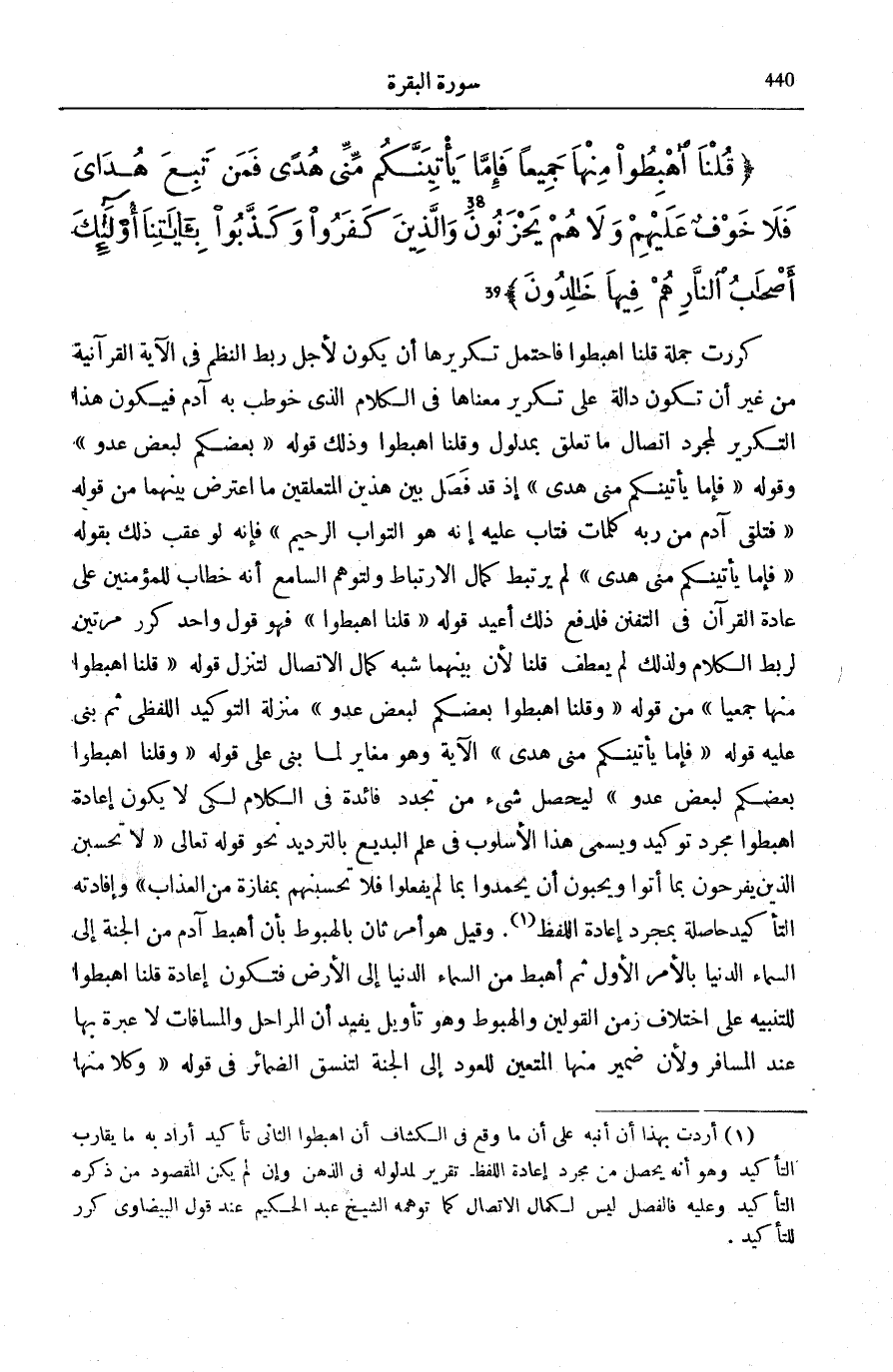 (¬1) أردْت بِهَذَا أَن أنبه على أَن مَا وَقع فِي «الْكَشَّاف» أَن اهبطوا الثَّانِي تَأْكِيد أَرَادَ بِهِ مَا يُقَارب التَّأْكِيد وَهُوَ أَنه يحصل من مُجَرّد إِعَادَة اللَّفْظ. تَقْرِير لمدلوله فِي الذِّهْن وَإِن لم يكن الْمَقْصُود من ذكره