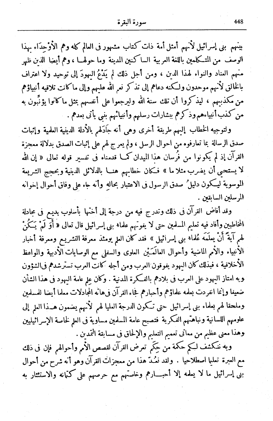 وَقَدْ أَفَاضَ الْقُرْآنُ فِي ذَلِكَ وَتَدَرَّجَ فِيهِ مِنْ دَرَجَةٍ إِلَى أُخْتِهَا بِأُسْلُوبٍ بَدِيعٍ فِي مُجَادَلَةِ الْمُخَاطَبِينَ وَأَفَادَ فِيهِ تَعْلِيمَ الْمُسْلِمِينَ حَتَّى لَا يَفُوتَهُمْ عُلَمَاءُ بَنِي إِسْرَائِيلَ قَالَ تَعَالَى: أَوَلَمْ يَكُنْ لَهُمْ آيَةً أَنْ يَعْلَمَهُ عُلَماءُ بَنِي إِسْرائِيلَ [الشُّعَرَاء: 197] فَقَدْ كَانَ الْعِلْمُ يَوْمَئِذٍ مَعْرِفَةَ التَّشْرِيعِ وَمَعْرِفَةَ أَخْبَارِ الْأَنْبِيَاءِ وَالْأُمَمِ الْمَاضِيَةِ وَأَحْوَالِ الْعَالَمَيْنِ الْعُلْوِيِّ وَالسُّفْلِيِّ مَعَ الْوِصَايَاتِ الْأَدَبِيَّةِ وَالْمَوَاعِظِ الْأَخْلَاقِيَّةِ، فَبِذَلِكَ كَانَ الْيَهُودُ يَفُوقُونَ الْعَرَبَ وَمِنْ أَجْلِهِ كَانَتِ الْعَرَبُ تسترشدهم فِي الشؤون وَبِهِ امْتَازَ الْيَهُودُ عَلَى الْعَرَبِ فِي بِلَادِهِمْ بِالْفِكْرَةِ الْمَدَنِيَّةِ.
