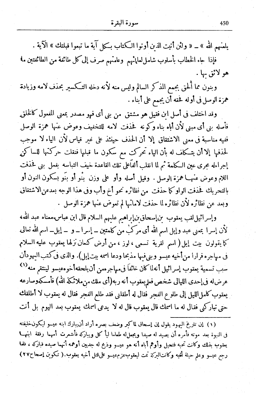 وَإِسْرَائِيلُ لَقَبُ يَعْقُوبَ بْنِ إِسْحَاقَ بْنِ إِبْرَاهِيمَ عَلَيْهِمُ السَّلَامُ قَالَ ابْنُ عَبَّاسٍ مَعْنَاهُ عَبْدُ اللَّهِ، لِأَنَّ إِسْرَا بِمَعْنَى عَبْدٍ وإيل اسْمُ اللَّهِ أَيْ مُرَكَّبٌ مِنْ كَلِمَتَيْنِ- إِسْرَا- وإيل- اسْمُ اللَّهِ تَعَالَى كَمَا يَقُولُونَ بَيْتُ إِيلَ (اسْمٌ لِقَرْيَةٍ تُسَمَّى لَوْزَ مِنْ أَرْضِ كَنْعَانَ نَزَلَهَا يَعْقُوبُ عَلَيْهِ السَّلَامُ فِي مُهَاجَرِهِ فِرَارًا مِنْ أَخِيهِ عِيسُو وَبَنَى فِيهَا مَذْبَحًا وَدَعَا اسْمَهُ بَيْتَ إِيلَ) .