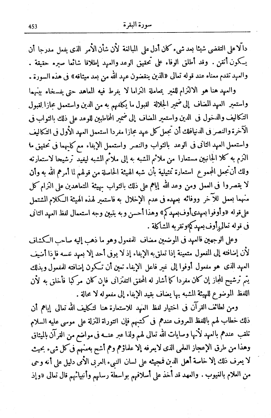 وَعَلَى الْوَجْهَيْنِ فَالْعَهْدُ فِي الْمَوْضِعَيْنِ مُضَافٌ لِلْمَفْعُولِ وَهُوَ مَا ذَهَبَ إِلَيْهِ صَاحِبُ «الْكَشَّافِ» لِأَنَّ إِضَافَتَهُ إِلَى الْمَفْعُولِ مُتَعَيِّنَةٌ إِذَا تَعَلَّقَ بِهِ الْإِيفَاءُ إِذْ لَا يُوفِي أَحَدٌ إِلَّا بِعَهْدِ نَفْسِهِ فَإِذَا أُضِيفَ الْعَهْدُ الَّذِي هُوَ مَفْعُولُ أَوْفُوا إِلَى غَيْرِ فَاعِلِ الْإِيفَاءِ تَعَيَّنَ أَنْ تَكُونَ إِضَافَتُهُ لِلْمَفْعُولِ وَبِذَلِكَ يَتِمُّ تَرْشِيحُ الْمَجَازِ إِنْ كَانَ مُفْرَدًا كَمَا أَشَارَ لَهُ الْمُحَقق التفتازانيّ فَإِنْ كَانَ مُرَكَّبًا فَأَخْلِقْ بِهِ لِأَنَّ اللَّفْظَ الْمَوْضُوعَ لِلْهَيْئَةِ الْمُشَبَّهِ بِهَا يُضَافُ بِقَيْدِ الْإِيفَاءِ إِلَى مَفْعُولِهِ لَا مَحَالَةَ.