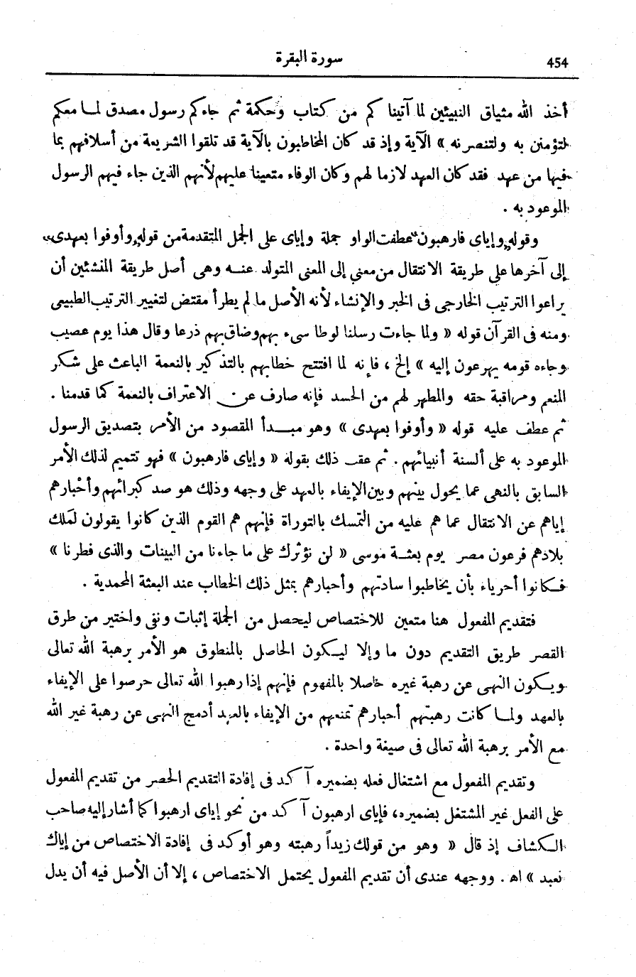 فَتَقْدِيمُ الْمَفْعُولِ هُنَا مُتَعَيِّنٌ لِلِاخْتِصَاصِ لِيَحْصُلَ مِنَ الْجُمْلَةِ إِثْبَاتٌ وَنَفْيٌ وَاخْتِيرَ مِنْ طُرُقِ الْقَصْرِ طَرِيقُ التَّقْدِيمِ دُونَ مَا وَإِلَّا لِيَكُونَ الْحَاصِلُ بِالْمَنْطُوقِ هُوَ الْأَمْرَ بِرَهْبَةِ اللَّهِ تَعَالَى وَيَكُونَ النَّهْيُ عَنْ رَهْبَةِ غَيْرِهِ حَاصِلًا بِالْمَفْهُومِ فَإِنَّهُمْ إِذَا رَهِبُوا اللَّهَ تَعَالَى حَرَصُوا عَلَى الْإِيفَاءِ بِالْعَهْدِ وَلَمَّا كَانَتْ رَهْبَتُهُمْ أَحْبَارَهُمْ تَمْنَعُهُمْ من الْإِيفَاء بالعهد أُدْمِجَ النَّهْيُ عَنْ رَهْبَةِ غَيْرِ اللَّهِ مَعَ الْأَمْرِ بِرَهْبَةِ اللَّهِ تَعَالَى فِي صِيغَةٍ وَاحِدَةٍ.