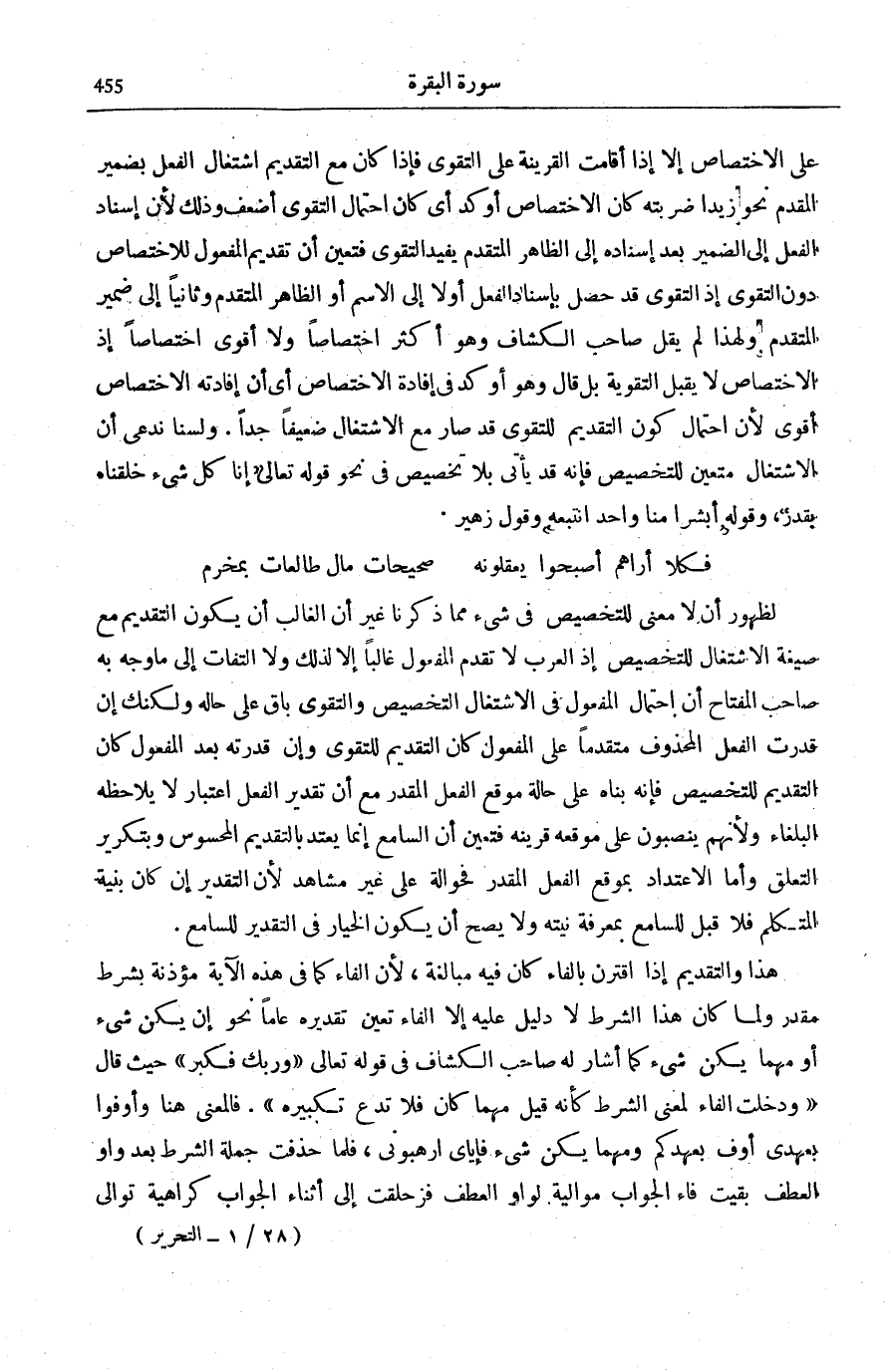 لِظُهُورِ أَنْ لَا مَعْنَى لِلتَّخْصِيصِ فِي شَيْءٍ مِمَّا ذَكَرْنَا غَيْرَ أَنَّ الْغَالِبَ أَنْ يَكُونَ التَّقْدِيمُ مَعَ صِيغَةِ الِاشْتِغَالِ لِلتَّخْصِيصِ إِذِ الْعَرَبُ لَا تُقَدِّمُ الْمَفْعُولَ غَالِبًا إِلَّا لِذَلِكَ وَلَا الْتِفَاتَ إِلَى مَا وَجَّهَ بِهِ صَاحِبُ «الْمِفْتَاحِ» أَنَّ احْتِمَالَ الْمَفْعُولِ فِي الِاشْتِغَالِ التَّخْصِيصُ وَالتَّقْوَى بَاقٍ عَلَى حَالِهِ وَلَكِنَّكَ إِنْ قَدَّرْتَ الْفِعْلَ الْمَحْذُوفَ مُتَقَدِّمًا عَلَى الْمَفْعُولِ كَانَ التَّقْدِيمُ لِلتَّقْوَى وَإِنْ قَدَّرْتَهُ بَعْدَ الْمَفْعُولِ كَانَ التَّقْدِيمُ لِلتَّخْصِيصِ فَإِنَّهُ بَنَاهُ عَلَى حَالَةِ مَوْقِعِ الْفِعْلِ الْمُقَدَّرِ مَعَ أَنَّ تَقْدِيرَ الْفِعْلِ اعْتِبَارٌ لَا يُلَاحِظُهُ الْبُلَغَاءُ وَلِأَنَّهُمْ يَنْصِبُونَ عَلَى مَوْقِعِهِ قَرِينَةً فَتَعَيَّنَ أَنَّ السَّامِعَ إِنَّمَا يَعْتَدُّ بِالتَّقْدِيمِ الْمَحْسُوسِ وَبِتَكْرِيرِ التَّعَلُّقِ وَأَمَّا الِاعْتِدَادُ بِمَوْقِعِ الْفِعْلِ الْمُقَدَّرِ فَحَوَالَةٌ عَلَى غَيْرِ مُشَاهَدٍ لِأَنَّ التَّقْدِيرَ إِنْ كَانَ بِنِيَّةِ الْمُتَكَلِّمِ فَلَا قِبَلَ لِلسَّامِعِ بِمَعْرِفَةِ نِيَّتِهِ وَلَا يَصِحُّ أَنْ يَكُونَ الْخِيَارُ فِي التَّقْدِيرِ لِلسَّامِعِ.