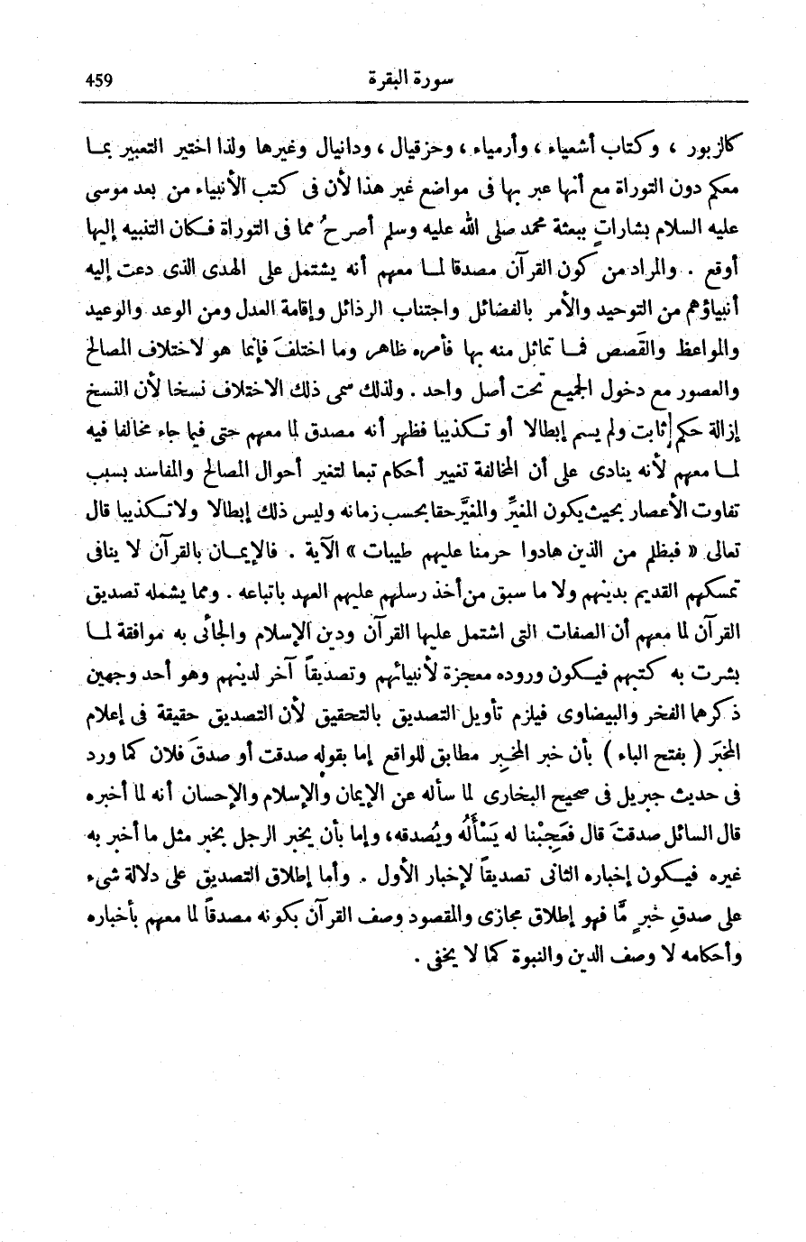وَالْمُرَادُ مِنْ كَوْنِ الْقُرْآنِ مُصَدِّقًا لِمَا مَعَهُمْ أَنَّهُ يَشْتَمِلُ عَلَى الْهُدَى الَّذِي دَعَتْ إِلَيْهِ أَنْبِيَاؤُهُمْ مِنَ التَّوْحِيدِ وَالْأَمْرِ بِالْفَضَائِلِ وَاجْتِنَابِ الرَّذَائِلِ وَإِقَامَةِ الْعَدْلِ وَمن الْوَعيد والوعد وَالْمَوَاعِظِ وَالْقَصَصِ فَمَا تَمَاثَلَ مِنْهُ بِهَا فَأَمْرُهُ ظَاهِرٌ وَمَا اخْتَلَفَ فَإِنَّمَا هُوَ لِاخْتِلَافِ الْمَصَالِحِ وَالْعُصُورِ مَعَ دُخُولِ الْجَمِيعِ تَحْتَ أَصْلٍ وَاحِدٍ، وَلِذَلِكَ سُمِّيَ ذَلِكَ الِاخْتِلَافُ نَسْخًا لِأَنَّ النَّسْخَ إِزَالَةُ حُكْمٍ ثَابِتٍ وَلَمْ يُسَمَّ إبطالا أَو تكذبيا فَظَهَرَ أَنَّهُ مُصَدِّقٌ لِمَا مَعَهُمْ حَتَّى فِيمَا جَاءَ مُخَالِفًا فِيهِ لِمَا مَعَهُمْ لِأَنَّهُ يُنَادِي عَلَى أَنَّ الْمُخَالَفَةَ تَغْيِيرُ أَحْكَامٍ تَبَعًا لِتَغَيُّرِ أَحْوَالِ الْمَصَالِحِ وَالْمَفَاسِدِ بِسَبَبِ تَفَاوُتِ الْأَعْصَارِ بِحَيْثُ يَكُونُ الْمُغَيِّرُ وَالْمُغَيَّرُ حَقًّا بِحَسَبِ زَمَانِهِ وَلَيْسَ ذَلِكَ إِبْطَالًا وَلَا تَكْذِيبًا قَالَ تَعَالَى: فَبِظُلْمٍ مِنَ الَّذِينَ هادُوا حَرَّمْنا عَلَيْهِمْ طَيِّباتٍ [النِّسَاء: 160] الْآيَةَ. فَالْإِيمَانُ بِالْقُرْآنِ لَا يُنَافِي تَمَسُّكَهُمُ الْقَدِيمَ بِدِينِهِمْ وَلَا مَا سَبَقَ مِنْ أَخْذِ رُسُلِهِمْ عَلَيْهِمُ الْعَهْدَ بِاتِّبَاعِهِ. وَمِمَّا يَشْمَلُهُ تَصْدِيقُ الْقُرْآنِ لِمَا مَعَهُمْ أَنَّ الصِّفَاتِ الَّتِي اشْتَمَلَ عَلَيْهَا الْقُرْآنُ وَدِينُ الْإِسْلَامِ وَالْجَائِي بِهِ مُوَافِقَةٌ لِمَا بَشَّرَتْ بِهِ كُتُبُهُمْ فَيَكُونُ وُرُودُهُ مُعْجِزَةً لِأَنْبِيَائِهِمْ وَتَصْدِيقًا آخَرَ لِدِينِهِمْ وَهُوَ أَحَدُ وَجْهَيْنِ ذَكَرَهُمَا الْفَخْرُ وَالْبَيْضَاوِيُّ فَيَلْزَمُ تَأْوِيلُ التَّصْدِيقِ بِالتَّحْقِيقِ لِأَن التَّصْدِيق حَقِيقَة فِي إِعْلَامِ الْمُخْبَرِ (بِفَتْحِ الْبَاءِ) بِأَنَّ خَبَرَ الْمُخْبِرِ مُطَابِقٌ لِلْوَاقِعِ إِمَّا بِقَوْلِهِ صَدَقْتَ أَوْ صَدَقَ فُلَانٌ كَمَا وَرَدَ فِي حَدِيثِ جِبْرِيلَ فِي «صَحِيحِ الْبُخَارِيِّ» لَمَّا سَأَلَهُ عَنِ الْإِيمَانِ وَالْإِسْلَامِ وَالْإِحْسَانِ أَنَّهُ لَمَّا أَخْبَرَهُ قَالَ السَّائِلُ صَدَقْتَ قَالَ: فَعَجِبْنَا لَهُ يَسْأَلُهُ وَيُصَدِّقُهُ، وَإِمَّا بِأَنْ يُخْبِرَ الرَّجُلُ بِخَبَرٍ مِثْلَ مَا أَخْبَرَ بِهِ غَيْرُهُ فَيَكُونُ إِخْبَارُهُ الثَّانِيَ تَصْدِيقًا لِإِخْبَارِ الْأَوَّلِ. وَأَمَّا إِطْلَاقُ التَّصْدِيقِ عَلَى دِلَالَةِ شَيْءٍ عَلَى صِدْقِ خَبَرٍ مَا فَهُوَ إِطْلَاقٌ مَجَازِيٌّ وَالْمَقْصُودُ وَصْفُ الْقُرْآنِ بِكَوْنِهِ مُصَدِّقًا لِمَا مَعَهُمْ بِأَخْبَارِهِ وَأَحْكَامِهِ لَا وَصْفُ الدِّينِ وَالنُّبُوَّةِ كَمَا لَا يَخْفَى.