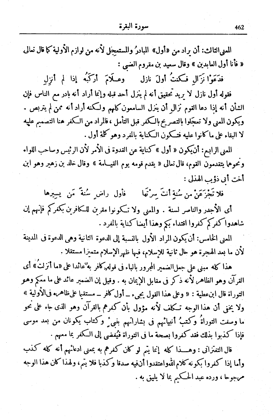وَيَكُونُ الْمَعْنَى وَلَا تَعْجَلُوا بِالتَّصْرِيحِ بِالْكُفْرِ قَبْلَ التَّأَمُّلِ، فَالْمُرَادُ مِنَ الْكُفْرِ هُنَا التَّصْمِيمُ عَلَيْهِ لَا الْبَقَاءُ عَلَى مَا كَانُوا عَلَيْهِ فَتَكُونُ الْكِنَايَةُ بِالْمُفْرَدِ وَهُوَ كَلِمَةُ (أَوَّلَ) .