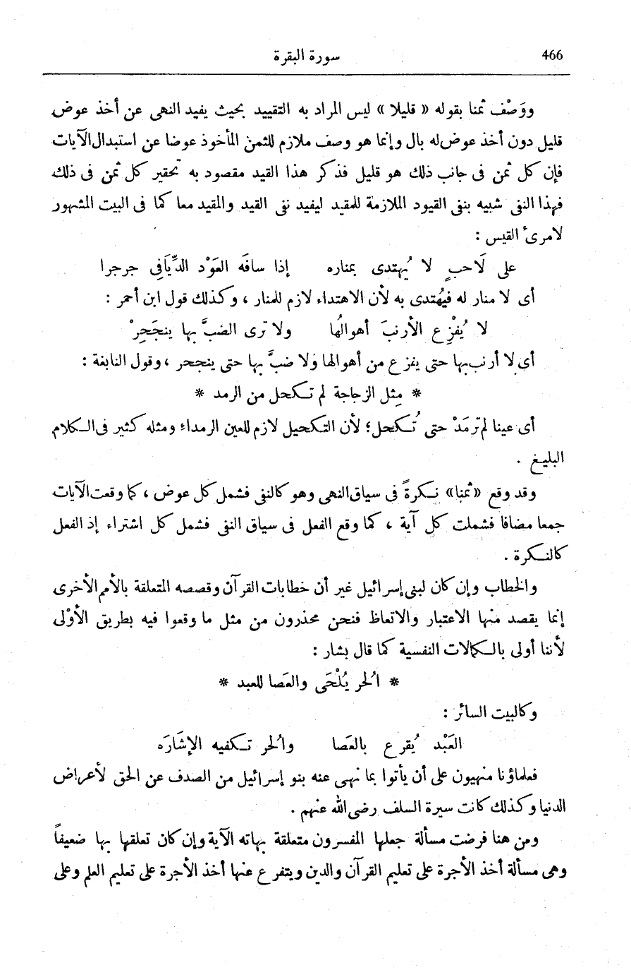 وَوَصَفَ ثَمَناً بِقَوْلِهِ: قَلِيلًا لَيْسَ الْمُرَادُ بِهِ التَّقْيِيدَ بِحَيْثُ يُفِيدُ النَّهْيَ عَنْ أَخْذِ عِوَضٍ قَلِيلٍ دُونَ أَخْذِ عِوَضٍ لَهُ بَالٌ وَإِنَّمَا هُوَ وَصْفٌ مُلَازِمٌ لِلثَّمَنِ الْمَأْخُوذِ عِوَضًا عَنِ اسْتِبْدَالِ الْآيَاتِ فَإِنَّ كُلَّ ثَمَنٍ فِي جَانِبِ ذَلِكَ هُوَ قَلِيلٌ فَذِكْرُ هَذَا الْقَيْدِ مَقْصُودٌ بِهِ تَحْقِيرُ كُلِّ ثَمَنٍ فِي ذَلِكَ فَهَذَا النَّفْيُ شَبِيهٌ بِنَفْيِ الْقُيُودِ الْمُلَازِمَةِ لِلْمُقَيَّدِ لِيُفِيدَ نَفْيَ الْقَيْدِ وَالْمُقَيَّدِ مَعًا كَمَا فِي الْبَيْت الْمَشْهُور لامرىء الْقَيْسِ: