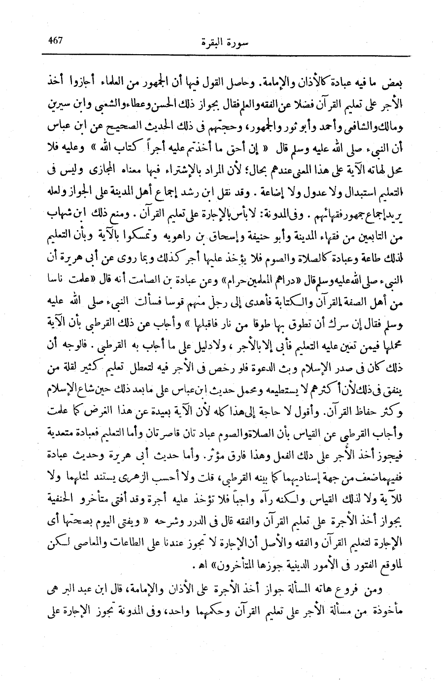 وَأَجَابَ عَنْ ذَلِكَ الْقُرْطُبِيُّ بِأَنَّ الْآيَةَ مَحْمَلُهَا فِيمَنْ تَعَيَّنَ عَلَيْهِ التَّعْلِيمُ فَأَبَى إِلَّا بِالْأَجْرِ، وَلَا دَلِيلَ عَلَى مَا أَجَابَ بِهِ الْقُرْطُبِيُّ. فَالْوَجْهُ أَنَّ ذَلِكَ كَانَ فِي صَدْرِ الْإِسْلَامِ وَبَثِّ الدَّعْوَةِ فَلَوْ رَخَّصَ فِي الْأجر فِيهِ لتعلل تَعْلِيمٌ كَثِيرٌ لِقِلَّةِ مِنْ يُنْفِقُ فِي ذَلِكَ لِأَنَّ أَكْثَرَهُمْ لَا يَسْتَطِيعُهُ وَمَحْمَلُ حَدِيثِ ابْنِ عَبَّاسٍ عَلَى مَا بَعْدَ ذَلِكَ حِينَ شَاعَ الْإِسْلَامُ وَكَثُرَ حُفَّاظُ الْقُرْآنِ. وَأَقُولُ لَا حَاجَةَ إِلَى هَذَا كُلِّهِ لِأَنَّ الْآيَةَ بَعِيدَةٌ عَنْ هَذَا الْغَرَضِ