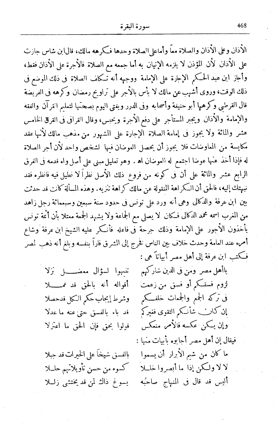 الْأَذَانِ وَعَلَى الْأَذَانِ وَالصَّلَاةِ مَعًا وَأَمَّا عَلَى الصَّلَاةِ وَحْدَهَا فَكَرِهَهُ مَالِكٌ، قَالَ ابْنُ شَاسٍ جَازَتْ عَلَى الْأَذَانِ لِأَنَّ الْمُؤَذِّنَ لَا يَلْزَمُهُ الْإِتْيَانُ بِهِ أَمَّا جَمْعُهُ مَعَ الصَّلَاةِ فَالْأُجْرَةُ عَلَى الْأَذَانِ فَقَطْ، وَأَجَازَ ابْنُ عَبْدِ الْحَكَمِ الْإِجَارَةَ عَلَى الْإِمَامَةِ وَوَجْهُهُ أَنَّهُ تَكَلَّفَ الصَّلَاةَ فِي ذَلِكَ الْمَوْضِعِ فِي ذَلِكَ الْوَقْتِ، وَرَوَى أَشْهَبٌ عَنْ مَالِكٍ لَا بَأْسَ بِالْأَجْرِ عَلَى تَرَاوِيحِ رَمَضَانَ وَكَرِهَهُ فِي الْفَرِيضَةِ قَالَ الْقُرْطُبِيُّ: وَكَرِهَهَا أَبُو حَنِيفَةَ وَأَصْحَابُهُ وَفِي «الدُّرَرِ» وَيُفْتَى الْيَوْمَ بِصِحَّتِهَا لِتَعْلِيمِ الْقُرْآنِ وَالْفِقْهِ وَالْإِمَامَةِ وَالْأَذَانِ وَيُجْبَرُ الْمُسْتَأْجِرُ عَلَى دَفْعِ الْأُجْرَةِ وَيُحْبَسُ، وَقَالَ الْقَرَافِيُّ فِي الْفَرْقِ الْخَامِسَ عَشَرَ وَالْمِائَةِ: وَلَا يَجُوزُ فِي إِمَامَةِ الصَّلَاةِ الْإِجَارَةُ عَلَى الْمَشْهُورِ مِنْ مَذْهَبِ مَالِكٍ لِأَنَّهَا عَقْدُ مُكَايَسَةٍ مِنَ الْمُعَاوَضَاتِ فَلَا يَجُوزُ أَنْ يَحْصُلَ الْعِوَضَانِ فِيهَا لِشَخْصٍ وَاحِدٍ لِأَنَّ أَجْرَ الصَّلَاةِ لَهُ فَإِذَا أَخَذَ عَنْهَا عِوَضًا اجْتَمَعَ لَهُ العوضان اهـ. وَهُوَ تَعْلِيلٌ مَبْنِيٌّ عَلَى أَصْلٍ وَاهٍ قَدَّمَهُ فِي الْفَرْقِ الرَّابِعَ عَشَرَ وَالْمِائَةِ عَلَى أَنَّ فِي كَوْنِهِ مِنْ فُرُوعِ ذَلِكَ الْأَصْلِ نَظَرًا لَا نُطِيلُ فِيهِ فَانْظُرْهُ فَقَدْ نَبَّهْتُكَ إِلَيْهِ، فَالْحَقُّ أَنَّ الْكَرَاهَةَ الْمَنْقُولَةَ عَنْ مَالِكٍ كَرَاهَةُ تَنْزِيهٍ. وَهَذِهِ الْمَسْأَلَةُ كَانَتْ قَدْ حَدَثَتْ بَيْنَ ابْنِ عَرَفَةَ وَالدَّكَّالِيِّ وَهِيَ أَنَّهُ وَرَدَ عَلَى تُونُسَ فِي حُدُودِ سَنَةِ سَبْعِينَ وَسَبْعِمِائَةٍ رَجُلٌ زَاهِدٌ مِنَ الْمَغْرِبِ اسْمُهُ مُحَمَّدٌ الدَّكَّالِيُّ فَكَانَ لَا يُصَلِّي مَعَ الْجَمَاعَةِ وَلَا يَشْهَدُ الْجُمْعَةَ مُعْتَلًّا بِأَنَّ أَئِمَّةَ تُونُسَ يَأْخُذُونَ الْأُجُورَ عَلَى الْإِمَامَةِ وَذَلِكَ جُرْحَةٌ فِي فَاعِلِهِ فَأَنْكَرَ عَلَيْهِ الشَّيْخُ ابْنُ عَرَفَةَ وَشَاعَ أَمْرُهُ عِنْدَ الْعَامَّةِ وَحَدَثَ خِلَافٌ بَيْنَ النَّاسِ فَخَرَجَ إِلَى الْمَشْرِقِ فَارًّا بِنَفْسِهِ وَبَلَغَ أَنَّهُ ذَهَبَ لِمِصْرَ فَكَتَبَ ابْنُ عَرَفَةَ إِلَى أَهْلِ مِصْرَ أَبْيَاتًا هِيَ: