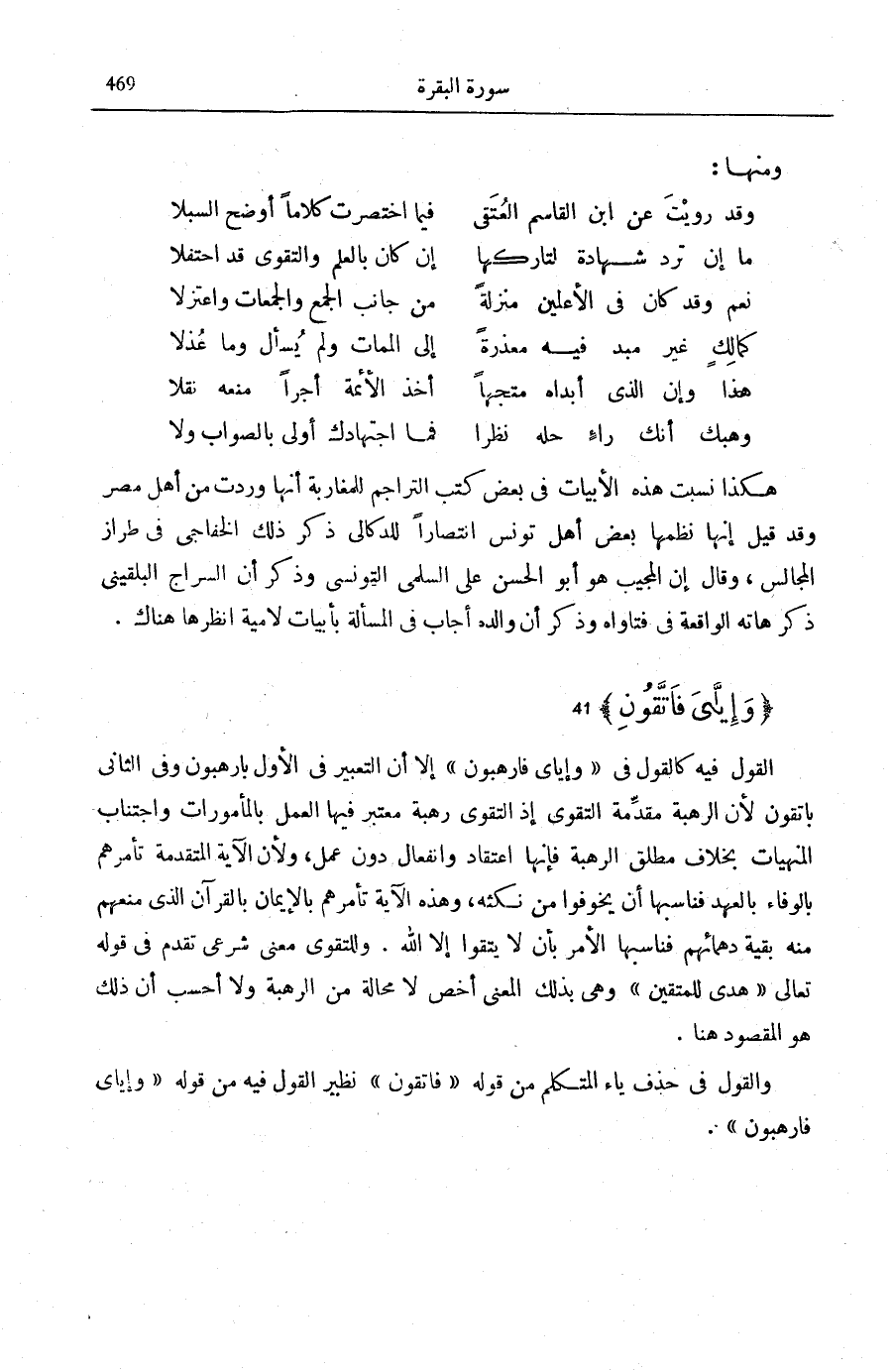 الْقَوْلُ فِيهِ كَالْقَوْلِ فِي وَإِيَّايَ فَارْهَبُونِ إِلَّا أَنَّ التَّعْبِير فِي الأولى بِارْهَبُونِ وَفِي الثَّانِي بِاتَّقُونِ لِأَنَّ الرَّهْبَةَ مُقَدِّمَةٌ التَّقْوَى إِذِ التَّقْوَى رَهْبَةٌ مُعْتَبَرٌ فِيهَا الْعَمَلُ بِالْمَأْمُورَاتِ وَاجْتِنَابُ الْمَنْهِيَّاتِ بِخِلَافِ مُطْلَقِ الرَّهْبَةِ فَإِنَّهَا اعْتِقَادٌ وَانْفِعَالٌ دُونَ عَمَلٍ، وَلِأَنَّ الْآيَةَ الْمُتَقَدِّمَةَ تَأْمُرُهُمْ بِالْوَفَاءِ بِالْعَهْدِ فَنَاسَبَهَا أَنْ يُخَوَّفُوا مَنْ نَكْثِهِ، وَهَذِهِ الْآيَةُ تَأْمُرُهُمْ بِالْإِيمَانِ