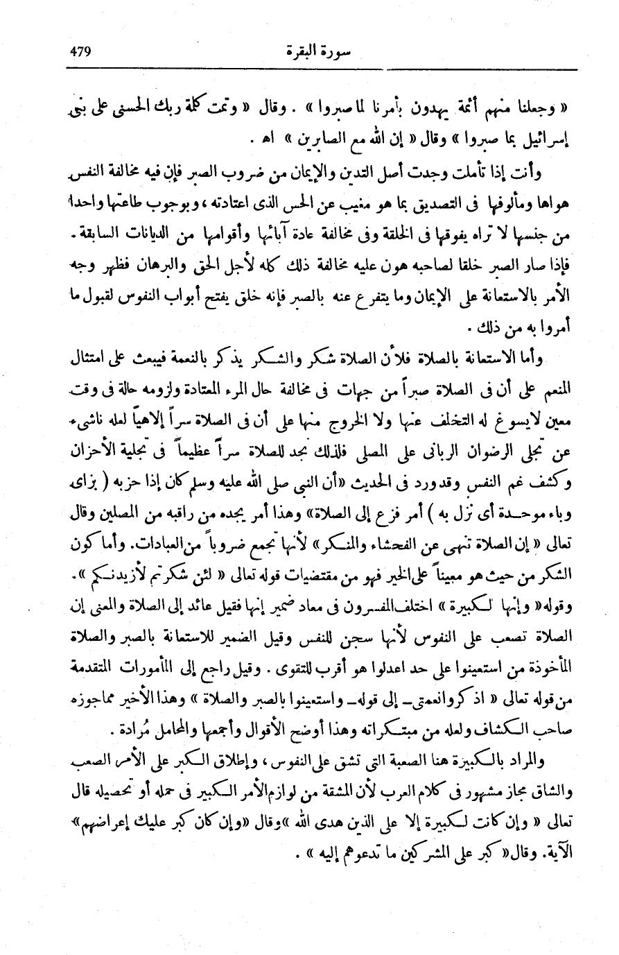 وَقَوْلُهُ: وَإِنَّها لَكَبِيرَةٌ اخْتَلَفَ الْمُفَسِّرُونَ فِي مَعَادِ ضَمِيرِ إِنَّها فَقِيلَ عَائِدٌ إِلَى الصَّلَاةِ وَالْمَعْنَى إِنَّ الصَّلَاةَ تَصْعُبُ عَلَى النُّفُوسِ لِأَنَّهَا سِجْنٌ لِلنَّفْسِ وَقِيلَ الضَّمِيرُ لِلِاسْتِعَانَةِ بِالصَّبْرِ وَالصَّلَاةِ الْمَأْخُوذَةِ مِنِ اسْتَعِينُوا عَلَى حَدِّ اعْدِلُوا هُوَ أَقْرَبُ لِلتَّقْوى [الْمَائِدَة: