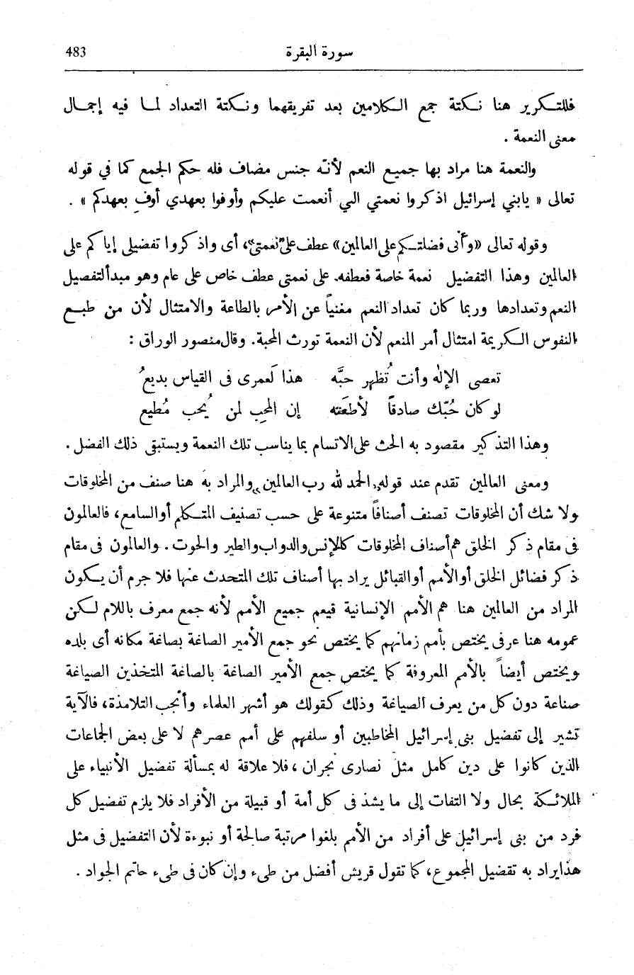 وَقَوْلِهِ تَعَالَى: وَأَنِّي فَضَّلْتُكُمْ عَلَى الْعالَمِينَ عَطْفٌ عَلَى نِعْمَتِيَ أَيْ وَاذْكُرُوا تَفْضِيلِي إِيَّاكُمْ عَلَى الْعَالَمِينَ وَهَذَا التَّفْضِيلُ نِعْمَةٌ خَاصَّةٌ فَعَطْفُهُ عَلَى (نِعْمَتِي) عَطْفُ خَاصٍّ عَلَى عَامٍّ وَهُوَ مبدأ لتفصيل النِّعَمِ وَتَعْدَادِهَا وَرُبَّمَا كَانَ تَعْدَادُ النِّعَمِ مُغْنِيًا عَنِ الْأَمْرِ بِالطَّاعَةِ وَالِامْتِثَالِ لِأَنَّ مِنْ طَبْعِ النُّفُوسِ الْكَرِيمَةِ امْتِثَالُ أَمْرِ الْمُنْعِمِ لِأَنَّ النِّعْمَةَ تُورِثُ الْمَحَبَّةَ. وَقَالَ مَنْصُورٌ الْوَرَّاقُ:
