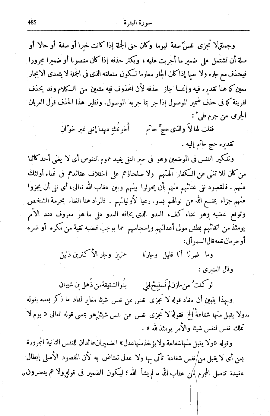 وَجُمْلَةُ: لَا تَجْزِي نَفْسٌ صِفَةٌ لِيَوْمًا وَكَانَ حَقُّ الْجُمْلَةِ إِذَا كَانَتْ خَبَرًا أَوْ صِفَةً أَوْ حَالًا أَوْ صِلَةً أَنْ تَشْتَمِلَ عَلَى ضَمِيرِ مَا أُجْرِيَتْ عَلَيْهِ، وَيَكْثُرُ حَذْفُهُ إِذَا كَانَ مَنْصُوبًا أَوْ ضَمِيرًا مَجْرُورًا فَيُحْذَفُ مَعَ جَارِّهِ وَلَا سِيَّمَا إِذَا كَانَ الْجَارُّ مَعْلُومًا لِكَوْنِ مُتَعَلِّقِهِ الَّذِي فِي الْجُمْلَةِ لَا يَتَعَدَّى إِلَّا بِجَارٍّ مُعَيَّنٍ كَمَا هُنَا تَقْدِيرُهُ فِيهِ وَإِنَّمَا جَازَ حَذْفُهُ لِأَنَّ الْمَحْذُوفَ فِيهِ مُتَعَيِّنٌ مِنَ الْكَلَامِ وَقَدْ يُحْذَفُ لِقَرِينَةٍ كَمَا فِي حَذْفِ ضَمِيرِ الْمَوْصُولِ إِذَا جُرَّ بِمَا جُرَّ بِهِ الْمَوْصُولُ. وَنَظِيرُ هَذَا الْحَذْفِ قَوْلُ الْعُرْيَانِ الْجَرْمِيِّ من جرم طَيء: