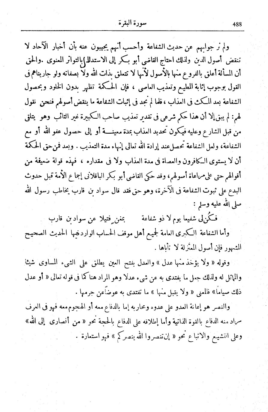 وَلَمْ نَرَ جَوَابَهُمْ عَنْ حَدِيثِ الشَّفَاعَةِ، وَأَحْسَبُ أَنَّهُمْ يُجِيبُونَ عَنْهُ بِأَنَّ أَخْبَارَ الْآحَادِ لَا تَنْقُضُ أُصُولَ الدِّينِ وَلِذَلِكَ احْتَاجَ الْقَاضِي أَبُو بَكْرٍ إِلَى الِاسْتِدْلَالِ بِالتَّوَاتُرِ الْمَعْنَوِيِّ.