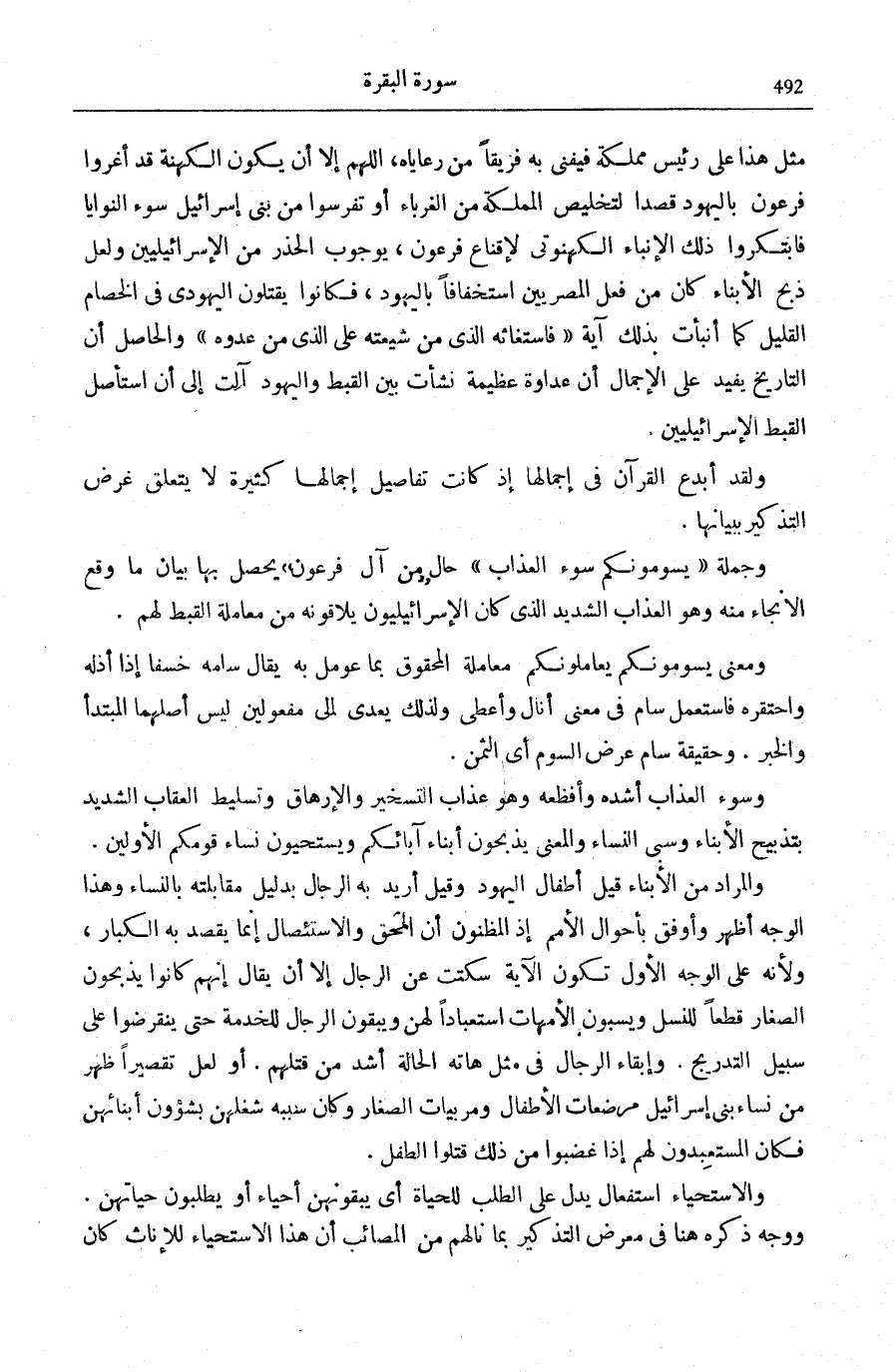 مِثْلُ هَذَا عَلَى رَئِيسِ مَمْلَكَةٍ فَيُفْنِي بِهِ فَرِيقًا مِنْ رَعَايَاهُ، اللَّهُمَّ إِلَّا أَنْ يَكُونَ الْكَهَنَةُ قَدْ أَغْرَوْا فِرْعَوْنَ بِالْيَهُودِ قَصْدًا لِتَخْلِيصِ الْمَمْلَكَةِ مِنَ الْغُرَبَاءِ أَوْ تَفَرَّسُوا مِنْ بَنِي إِسْرَائِيلَ سُوءَ النَّوَايَا فَابْتَكَرُوا ذَلِكَ الْإِنْبَاءَ الْكَهَنُوتِيَّ لِإِقْنَاعِ فِرْعَوْنَ، بِوُجُوبِ الْحَذَرِ مِنَ الْإِسْرَائِيلِيِّينَ وَلَعَلَّ ذَبْحَ الْأَبْنَاءِ كَانَ مِنْ فِعْلِ الْمِصْرِيِّينَ اسْتِخْفَافًا بِالْيَهُودِ، فَكَانُوا يَقْتُلُونَ الْيَهُودِيَّ فِي الْخِصَامِ الْقَلِيلِ كَمَا أَنْبَأَتْ بِذَلِكَ آيَةُ فَاسْتَغاثَهُ الَّذِي مِنْ شِيعَتِهِ عَلَى الَّذِي مِنْ عَدُوِّهِ [الْقَصَص: 15] وَالْحَاصِلُ أَنَّ التَّارِيخَ يُفِيدُ عَلَى الْإِجْمَالِ أَنَّ عَدَاوَةً عَظِيمَةً نَشَأَتْ بَيْنَ الْقِبْطِ وَالْيَهُودِ آلَتْ إِلَى أَنِ اسْتَأْصَلَ الْقِبْطُ الْإِسْرَائِيلِيِّينَ. وَلَقَدْ أَبْدَعَ الْقُرْآنُ فِي إِجْمَالِهَا إِذْ كَانَتْ تَفَاصِيلُ إِجْمَالِهَا كَثِيرَةً لَا يَتَعَلَّقُ غَرَضُ التَّذْكِيرِ بِبَيَانِهَا.