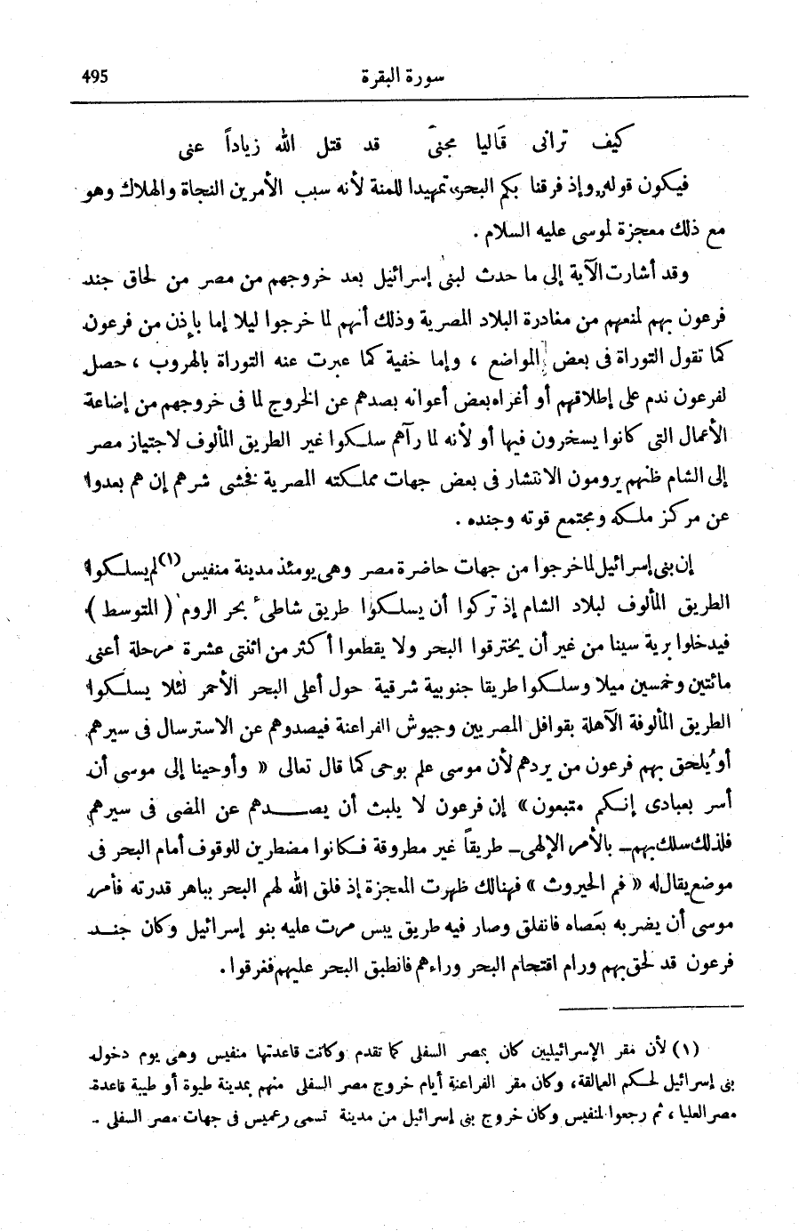 يَسْلُكُوا الطَّرِيقَ الْمَأْلُوفَ لِبِلَادِ الشَّامِ إِذْ تُرِكُوا أَنْ يسلكوا طَرِيق شاطىء بَحْرِ الرُّومِ (الْمُتَوَسِّطِ) فَيَدْخُلُوا بَرِّيَّةَ سِينَا مِنْ غَيْرِ أَنْ يَخْتَرِقُوا الْبَحْرَ وَلَا يَقْطَعُوا أَكْثَرَ من اثْنَتَيْ عرة مَرْحَلَةً أَعْنِي مِائَتَيْنِ وَخَمْسِينَ مِيلًا وَسَلَكُوا طَرِيقًا جَنُوبِيَّةً شَرْقِيَّةً حَوْلَ أَعْلَى الْبَحْرِ الْأَحْمَرِ لِئَلَّا يَسْلُكُوا الطَّرِيقَ الْمَأْلُوفَةَ الْآهِلَةَ بِقَوَافِلِ الْمِصْرِيِّينَ وَجُيُوشِ الْفَرَاعِنَةِ فَيَصُدُّوهُمْ عَنِ الِاسْتِرْسَالِ فِي سَيْرِهِمْ أَوْ يُلْحِقُ بِهِمْ فِرْعَوْنُ مَنْ يَرُدُّهُمْ لِأَنَّ مُوسَى عَلِمَ بِوَحْيٍ كَمَا قَالَ تَعَالَى: وَأَوْحَيْنا إِلى مُوسى أَنْ أَسْرِ بِعِبادِي إِنَّكُمْ مُتَّبَعُونَ [الشُّعَرَاء: 52] إِنَّ فِرْعَوْنَ لَا يَلْبَثُ أَنْ يَصُدَّهُمْ عَنِ الْمُضِيِّ فِي سَيْرِهِمْ فَلِذَلِكَ سَلَكَ بِهِمْ- بِالْأَمْرِ الْإِلَهِيِّ- طَرِيقًا غَيْرَ مَطْرُوقَةٍ فَكَانُوا مُضْطَرِّينَ لِلْوُقُوفِ أَمَامَ الْبَحْرِ فِي مَوْضِعٍ يُقَالُ لَهُ «فَمُ الْحَيْرُوثِ» فَهُنَالِكَ ظَهَرَتِ الْمُعْجِزَةُ إِذْ فَلَقَ اللَّهُ لَهُمُ الْبَحْرَ بِبَاهِرِ قُدْرَتِهِ فَأَمَرَ مُوسَى أَنْ يَضْرِبَهُ بِعَصَاهُ فَانْفَلَقَ وَصَارَ فِيهِ طَرِيقٌ يَبَسٌ مَرَّتْ عَلَيْهِ بَنُو إِسْرَائِيلَ وَكَانَ جُنْدُ فِرْعَوْنَ قَدْ لَحِقَ بِهِمْ وَرَامَ اقْتِحَامَ الْبَحْرِ وَرَاءَهُمْ فَانْطَبَقَ الْبَحْرُ عَلَيْهِمْ فَغَرِقُوا.