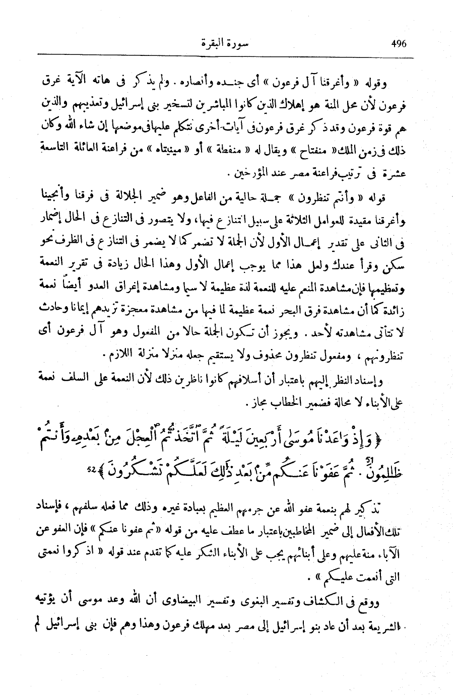 وَقَوْلُهُ: وَأَغْرَقْنا آلَ فِرْعَوْنَ أَيْ جُنْدَهُ وَأَنْصَارَهُ. وَلَمْ يَذْكُرْ فِي هَاتِهِ الْآيَةِ غَرَقَ فِرْعَوْنَ لِأَنَّ مَحَلَّ الْمِنَّةِ هُوَ إِهْلَاكُ الَّذِينَ كَانُوا الْمُبَاشِرِينَ لِتَسْخِيرِ بَنِي إِسْرَائِيلَ وَتَعْذِيبِهِمْ وَالَّذِينَ هُمْ قُوَّةُ فِرْعَوْنَ وَقَدْ ذُكِرَ غَرَقُ فِرْعَوْنَ فِي آيَاتٍ أُخْرَى نَتَكَلَّمُ عَلَيْهَا فِي مَوْضِعِهَا إِنْ شَاءَ اللَّهُ، وَكَانَ ذَلِكَ فِي زَمَنِ الْمَلِكِ «مَنْفِتَاحَ» وَيُقَالُ لَهُ «مَنْفِطَةُ» أَوْ «مِينِيتَاهْ» مِنْ فَرَاعِنَةِ الْعَائِلَةِ التَّاسِعَةَ عَشْرَةَ فِي تَرْتِيبِ فَرَاعِنَةِ مِصْرَ عِنْدَ الْمُؤَرِّخِينَ.