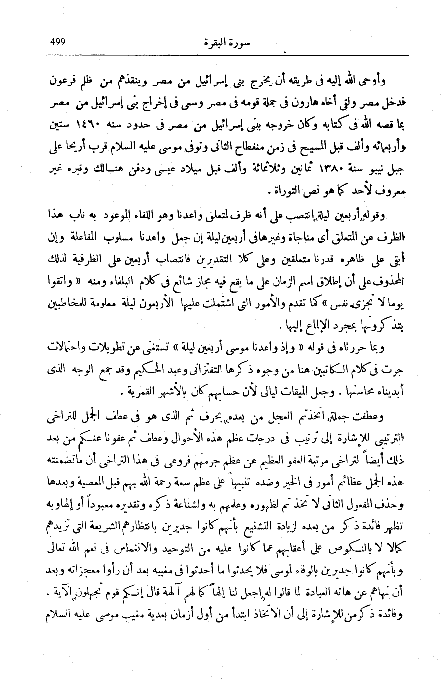 وَبِمَا حَرَّرْنَاهُ فِي قَوْلِهِ: وَإِذْ واعَدْنا مُوسى أَرْبَعِينَ لَيْلَةً تَسْتَغْنِي عَنْ تَطْوِيلَاتٍ وَاحْتِمَالَاتٍ جَرَتْ فِي كَلَامِ الْكَاتِبِينَ هُنَا مِنْ وُجُوه ذكرهَا التفتازانيّ وَعَبْدُ الْحَكِيمِ وَقَدْ جَمَعَ