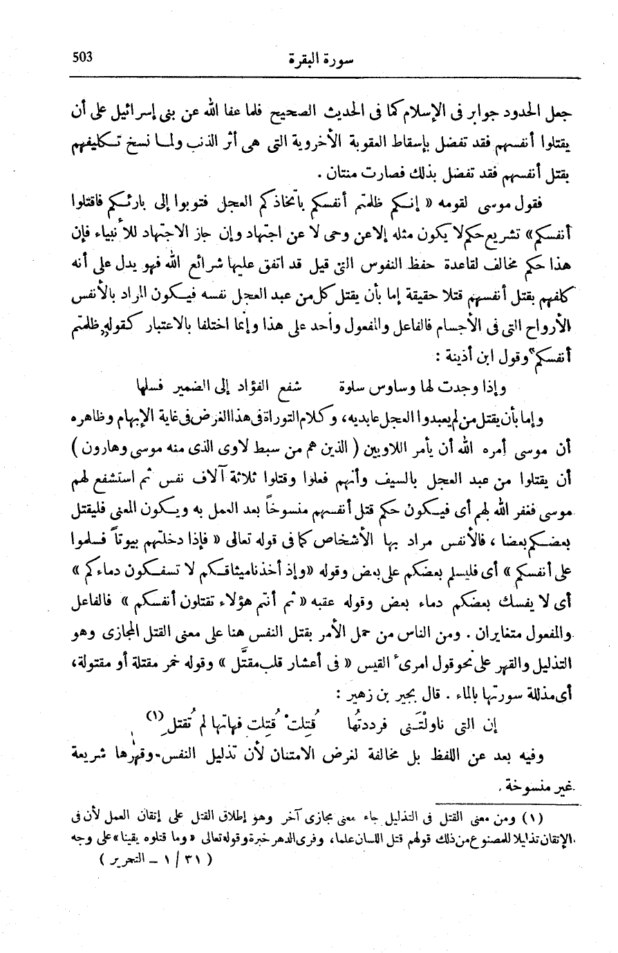 وَإِمَّا بِأَنْ يَقْتُلَ مَنْ لَمْ يَعْبُدُوا الْعِجْلَ عَابِدِيهِ، وَكَلَامُ التَّوْرَاةِ فِي هَذَا الْغَرَضِ فِي غَايَةِ الْإِبْهَامِ وَظَاهِرُهُ أَنَّ مُوسَى أَمَرَهُ اللَّهُ أَنْ يَأْمُرَ اللَّاوِيِّينَ- الَّذِينَ هُمْ مِنْ سِبْطِ لَاوِي الَّذِي مِنْهُ مُوسَى وَهَارُونُ- أَنْ يَقْتُلُوا مَنْ عَبَدَ الْعِجْلَ بِالسَّيْفِ وَأَنَّهُمْ فَعَلُوا وَقَتَلُوا ثَلَاثَةَ آلَافِ نَفْسٍ ثُمَّ اسْتَشْفَعَ لَهُمْ مُوسَى فَغَفَرَ اللَّهُ لَهُمْ أَيْ فَيَكُونُ حُكْمُ قَتْلِ أَنْفُسِهِمْ مَنْسُوخًا بَعْدَ الْعَمَلِ بِهِ وَيَكُونُ الْمَعْنَى فَلْيَقْتُلْ بَعْضُكُمْ بَعْضًا، فَالْأَنْفُسُ مُرَادٌ بِهَا الْأَشْخَاصُ كَمَا فِي قَوْلِهِ تَعَالَى: فَإِذا دَخَلْتُمْ بُيُوتاً فَسَلِّمُوا عَلى أَنْفُسِكُمْ [النُّور: 61] أَيْ فَلْيُسَلِّمْ بَعْضُكُمْ عَلَى بَعْضٍ وَقَوْلِهِ: وَإِذْ أَخَذْنا مِيثاقَكُمْ لَا تَسْفِكُونَ دِماءَكُمْ [الْبَقَرَة: 84] أَيْ لَا يَسْفِكُ بَعْضُكُمْ دِمَاءَ بَعْضٍ وَقَوْلِهِ
