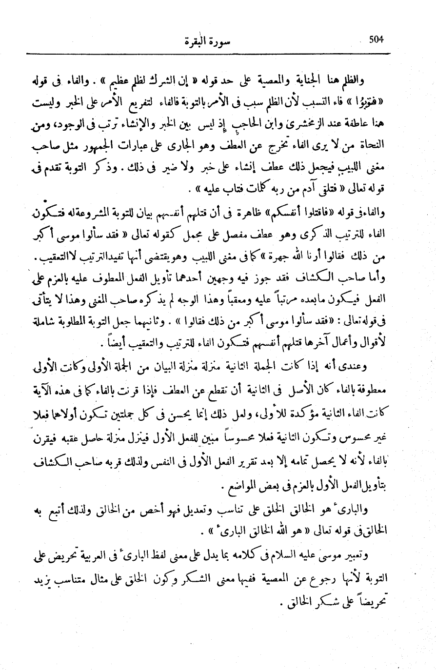 وَالْفَاءُ فِي قَوْلِهِ: فَاقْتُلُوا أَنْفُسَكُمْ ظَاهِرَةٌ فِي أَنَّ قَتْلَهُمْ أَنْفُسَهُمْ بَيَانٌ لِلتَّوْبَةِ الْمَشْرُوعَةِ لَهُ فَتَكُونُ الْفَاءُ لِلتَّرْتِيبِ الذِّكْرِيِّ وَهُوَ عَطْفُ مُفَصَّلٍ عَلَى مُجْمَلٍ كَقَوْلِهِ تَعَالَى: فَقَدْ سَأَلُوا مُوسى أَكْبَرَ مِنْ ذلِكَ فَقالُوا أَرِنَا اللَّهَ جَهْرَةً [النِّسَاء: 153] كَمَا فِي «مُغْنِي اللَّبِيبِ» وَهُوَ يَقْتَضِي أَنَّهَا تُفِيدُ التَّرْتِيبَ لَا التَّعْقِيبَ. وَأَمَّا صَاحِبُ «الْكَشَّافِ» فَقَدَ جَوَّزَ فِيهِ وَجْهَيْنِ أَحَدُهُمَا تَأْوِيلُ الْفِعْلِ الْمَعْطُوفِ عَلَيْهِ بِالْعَزْمِ عَلَى الْفِعْلِ فَيَكُونُ مَا بَعْدَهُ مُرَتَّبًا عَلَيْهِ وَمُعَقِّبًا وَهَذَا الْوَجْهُ لَمْ يَذْكُرْهُ صَاحِبُ «الْمُغْنِي» وَهَذَا لَا يَتَأَتَّى فِي قَوْلِهِ تَعَالَى: فَقَدْ سَأَلُوا مُوسى أَكْبَرَ مِنْ ذلِكَ فَقالُوا، وَثَانِيهِمَا جَعْلُ التَّوْبَةِ الْمَطْلُوبَةِ شَامِلَةً لِأَقْوَالٍ وَأَعْمَالٍ آخِرُهَا قَتْلُهُمْ أَنْفُسَهُمْ فَتَكُونُ