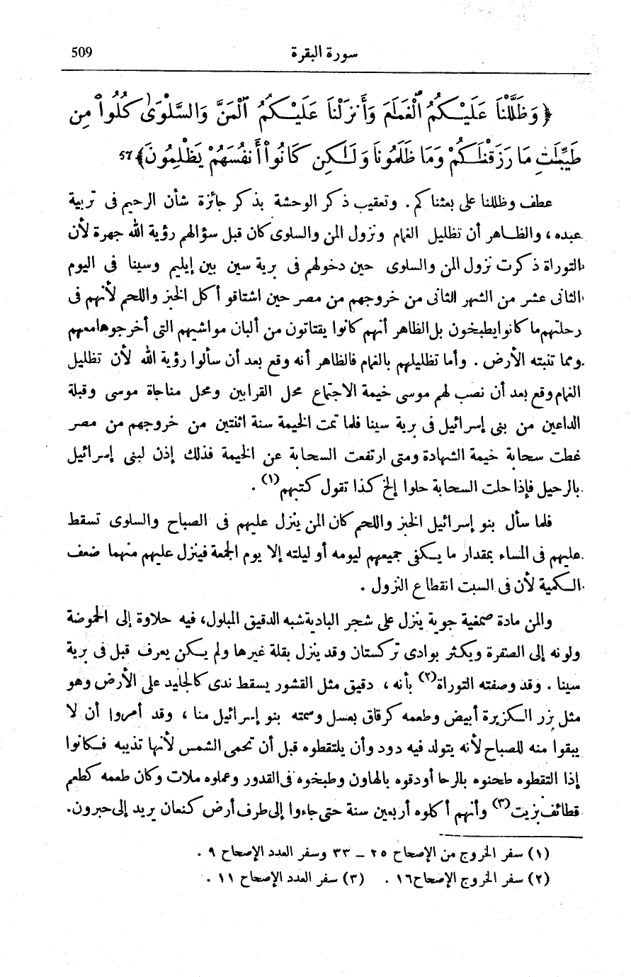 عَطْفُ وَظَلَّلْنا على بَعَثْناكُمْ [الْبَقَرَة: 56] . وَتَعْقِيبُ ذِكْرِ الْوَحْشَةِ بِذِكْرِ جَائِزَةٍ شَأْنُ الرَّحِيمِ فِي تَرْبِيَةِ عَبْدِهِ، وَالظَّاهِرُ أَنَّ تَظْلِيلَ الْغَمَامِ وَنُزُولَ الْمَنِّ وَالسَّلْوَى كَانَ قَبْلَ سُؤَالِهِمْ رُؤْيَةَ اللَّهِ جَهْرَةً لِأَنَّ التَّوْرَاةَ ذَكَرَتْ نُزُولَ الْمَنِّ وَالسَّلْوَى حِينَ دُخُولِهِمْ فِي بَرِّيَّةِ سِينَ بَيْنَ إِيلِيمَ وَسِينَا فِي الْيَوْمِ الثَّانِيَ عَشَرَ مِنَ الشَّهْرِ الثَّانِي مِنْ خُرُوجِهِمْ مِنْ مِصْرَ حِينَ اشْتَاقُوا أَكْلَ الْخُبْزِ وَاللَّحْمِ لِأَنَّهُمْ فِي رِحْلَتِهِمْ مَا كَانُوا يَطْبُخُونَ بَلِ الظَّاهِرُ أَنَّهُمْ كَانُوا يَقْتَاتُونَ مِنْ أَلْبَانِ مَوَاشِيهِمُ الَّتِي أَخْرَجُوهَا مَعَهُمْ وَمِمَّا تُنْبِتُهُ الْأَرْضُ. وَأَمَّا تَظْلِيلُهُمْ بِالْغَمَامِ فَالظَّاهِرُ أَنَّهُ وَقَعَ بَعْدَ أَنْ سَأَلُوا رُؤْيَةَ اللَّهِ لِأَنَّ تَظْلِيلَ الْغَمَامِ وَقَعَ بَعْدَ أَنْ نَصَبَ لَهُمْ مُوسَى خَيْمَةَ الِاجْتِمَاعِ مَحَلَّ الْقَرَابِينِ وَمَحَلَّ مُنَاجَاةِ مُوسَى وَقِبْلَةَ الدَّاعِينَ مِنْ بَنِي إِسْرَائِيلَ فِي بَرِّيَّةِ سِينَا فَلَمَّا تَمَّتِ الْخَيْمَةُ سَنَةَ اثْنَتَيْنِ مِنْ خُرُوجِهِمْ مِنْ مِصْرَ غَطَّتْ سَحَابَةٌ خَيْمَةَ الشَّهَادَةِ وَمَتَى ارْتَفَعَتِ السَّحَابَةُ عَنِ الْخَيْمَةِ فَذَلِكَ إِذْنٌ لِبَنِي إِسْرَائِيلَ بِالرَّحِيلِ فَإِذَا حَلَّتِ السَّحَابَةُ حَلُّوا إِلَخْ كَذَا تَقُولُ كُتُبُهُمْ (¬1) . فَلَمَّا سَأَلَ بَنُو إِسْرَائِيلَ الْخُبْزَ وَاللَّحْمَ كَانَ الْمَنُّ يَنْزِلُ عَلَيْهِمْ فِي الصَّبَاحِ وَالسَّلْوَى تَسْقُطُ عَلَيْهِمْ فِي الْمَسَاءِ بِمِقْدَارِ مَا يَكْفِي جَمِيعَهُمْ لِيَوْمِهِ أَوْ لَيْلَتِهِ إِلَّا يَوْمَ الْجُمْعَةِ فَيَنْزِلُ عَلَيْهِمْ مِنْهُمَا ضِعْفُ الْكِمِّيَّةِ لِأَنَّ فِي السَّبْتِ انْقِطَاعَ النُّزُولِ.