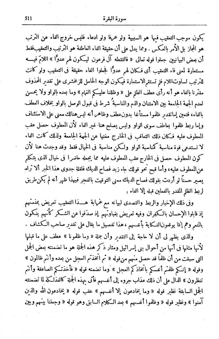 وَمِمَّا يَدُلُّ عَلَى أَنَّ حَقِيقَةَ الْفَاءِ الْعَاطِفَةِ هُوَ التَّرْتِيبُ وَالتَّعْقِيبُ فَقَطْ أَنَّ بَعْضَ الْبَيَانِيِّينَ جَعَلُوا قَوْلَهُ تَعَالَى: فَالْتَقَطَهُ آلُ فِرْعَوْنَ لِيَكُونَ لَهُمْ عَدُوًّا [الْقَصَص: 8] اللَّامُ فِيهِ مُسْتَعَارَةٌ لِمَعْنَى فَاءِ التَّعْقِيبِ أَيْ فَكَانَ لَهُمْ عَدُوًّا فَجَعَلُوا الْفَاءَ حَقِيقَةً فِي التَّعْقِيبِ وَلَوْ كَانَتْ لِلتَّرْتِيبِ لَسَاوَتِ اللَّامَ فَلَمْ تَسْتَقِمِ الِاسْتِعَارَةُ فَيَكُونُ الْوَجْهُ الْحَامِلُ لِلزَّمَخْشَرِيِّ عَلَى تَقْدِيرِ الْمَحْذُوفِ مُقْتَرِنًا بِالْفَاءِ هُوَ أَنَّهُ رَأَى عَطْفَ الظُّلْمِ عَلَى وَظَلَّلْنا عَلَيْكُمُ الْغَمامَ وَمَا بَعْدَهُ بِالْوَاوِ وَلَا يَحْسُنُ لِعَدَمِ الْجِهَةِ الْجَامِعَةِ بَيْنَ الِامْتِنَانِ وَالذَّمِّ وَالْمُنَاسَبَةُ شَرْطٌ فِي قَبُولِ الْوَصْلِ بِالْوَاوِ بِخِلَافِ الْعَطْفِ بِالْفَاءِ، فَتَعَيَّنَ إِمَّا تَقْدِيرُ ظَلَمُوا مُسْتَأْنَفًا بِدُونِ عَطْفٍ وَظَاهَرٌ أَنَّهُ لَيْسَ هُنَالِكَ مَعْنًى عَلَى الِاسْتِئْنَافِ وَإِمَّا رَبْطُ ظَلَمُوا بِعَاطِفٍ سِوَى الْوَاوِ وَلَيْسَ يَصْلُحُ هُنَا غَيْرُ الْفَاءِ لِأَنَّ الْمَعْطُوفَ حَصَلَ عَقِبَ الْمَعْطُوفِ عَلَيْهِ فَكَانَ ذَلِكَ التَّعَاقُبُ فِي الْخَارِجِ مُغْنِيًا عَنِ الْجِهَةِ الْجَامِعَةِ وَلِذَلِكَ كَانَتِ الْفَاءُ لَا تَسْتَدْعِي قُوَّةَ مُنَاسَبَةٍ كَمُنَاسَبَةِ الْوَاوِ وَلَكِنْ مُنَاسِبَةً فِي الْخَيَالِ فَقَطْ وَقَدْ وُجِدَتْ هُنَا لِأَنَّ كَوْنَ الْمَعْطُوفِ حَصَلَ فِي الْخَارِجِ عَقِبَ الْمَعْطُوفِ عَلَيْهِ مِمَّا يَجْعَلُهُ حَاضِرًا فِي خَيَالِ الَّذِي يَتَكَلَّمُ عَنِ الْمَعْطُوفِ عَلَيْهِ، وَأَمَّا قُبْحُ نَحْوِ قَوْلِكَ جَاءَ زَيْدٌ فَصَاحَ الدِّيكُ فَلِقِلَّةِ جَدْوَى هَذَا الْخَبَرِ أَلَا تَرَاهُ يَصِيرُ حَسَنًا لَوْ أَرَدْتَ بِقَوْلِكَ فَصَاحَ الدِّيكُ مَعْنَى التَّوْقِيتِ بِالْفَجْرِ فَبِهَذَا ظَهَرَ أَنَّهُ لَمْ يَكُنْ طَرِيقٌ لِرَبْطِ الظُّلْمِ الْمُقَدَّرِ بِالْفِعْلَيْنِ قَبْلَهُ إِلَّا الْفَاءُ.