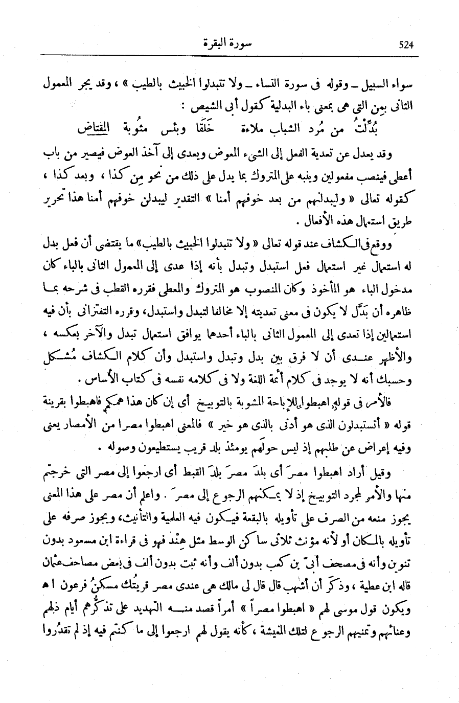 وَوَقَعَ فِي «الْكَشَّافِ» عِنْدَ قَوْلِهِ تَعَالَى: وَلا تَتَبَدَّلُوا الْخَبِيثَ بِالطَّيِّبِ مَا يَقْتَضِي أَنَّ فِعْلَ بَدَّلَ لَهُ اسْتِعْمَالٌ غَيْرَ اسْتِعْمَالِ فِعْلِ اسْتَبْدَلَ وَتَبَدَّلَ بِأَنَّهُ إِذَا عُدِّيَ إِلَى الْمَعْمُولِ الثَّانِي بِالْبَاءِ كَانَ مَدْخُولُ الْبَاءِ هُوَ الْمَأْخُوذَ وَكَانَ الْمَنْصُوبُ هُوَ الْمَتْرُوكَ وَالْمُعْطِيَ فَقَرَّرَهُ الْقُطْبُ فِي «شَرْحِهِ» بِمَا ظَاهِرُهُ أَنَّ بَدَّلَ لَا يَكُونُ فِي مَعْنَى تَعْدِيَتِهِ إِلَّا مُخَالِفًا لِتَبَدَّلَ واستبدل، وَقَررهُ التفتازانيّ بِأَنَّ فِيهِ اسْتِعْمَالَيْنِ إِذَا تَعَدَّى إِلَى الْمَعْمُولِ الثَّانِي بِالْبَاءِ أَحَدُهُمَا يُوَافِقُ اسْتِعْمَالَ تَبَدَّلَ وَالْآخَرُ بِعَكْسِهِ، وَالْأَظْهَرُ عِنْدِي أَنْ لَا فَرْقَ بَيْنَ بَدَّلَ وَتَبَدَّلَ وَاسْتَبْدَلَ وَأَنَّ كَلَامَ «الْكَشَّافِ» مُشْكِلٌ وَحَسْبُكَ أَنَّهُ لَا يُوجَدُ فِي كَلَامِ أَئِمَّةِ اللُّغَةِ وَلَا فِي كَلَامِهِ نَفْسِهِ فِي كِتَابِ «الْأَسَاسِ» .