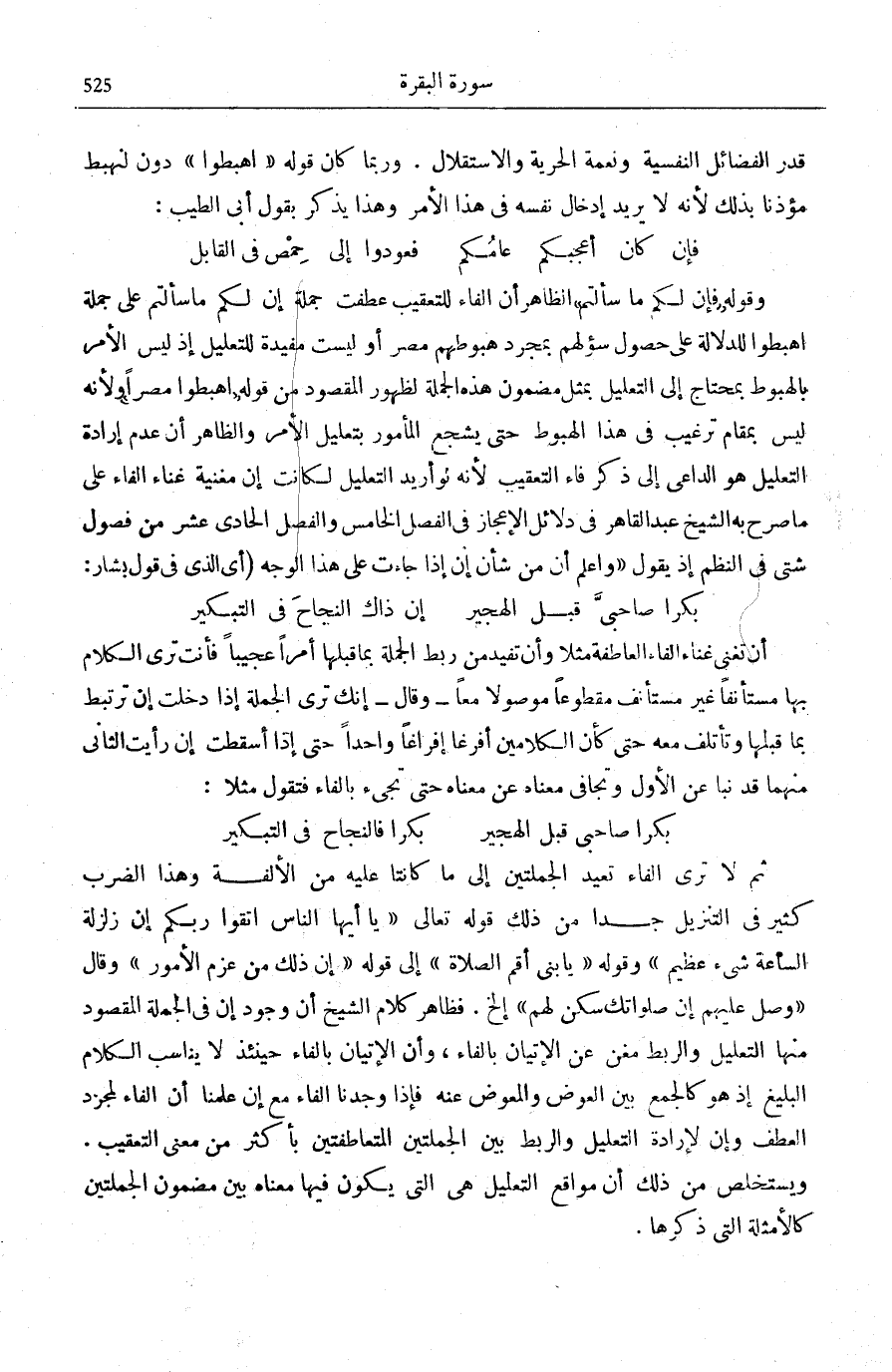 التَّنْزِيلِ جِدًّا مِنْ ذَلِكَ قَوْلُهُ تَعَالَى: يَا أَيُّهَا النَّاسُ اتَّقُوا رَبَّكُمْ إِنَّ زَلْزَلَةَ السَّاعَةِ شَيْءٌ عَظِيمٌ [الْحَج: 1] وَقَوْلُهُ: يَا بُنَيَّ أَقِمِ الصَّلاةَ إِلَى قَوْلِهِ: إِنَّ ذلِكَ مِنْ عَزْمِ الْأُمُورِ [لُقْمَان: 17] وَقَالَ: وَصَلِّ عَلَيْهِمْ إِنَّ صَلاتَكَ سَكَنٌ لَهُمْ [التَّوْبَة: 103] إِلَخْ. فَظَاهِرُ كَلَامِ الشَّيْخِ أَنَّ وُجُودَ إِنَّ فِي الْجُمْلَةِ الْمَقْصُودُ مِنْهَا التَّعْلِيلُ وَالرَّبْطُ مُغْنٍ عَنِ الْإِتْيَانِ بِالْفَاءِ، وَأَنَّ الْإِتْيَانَ بِالْفَاءِ حِينَئِذٍ لَا يُنَاسِبُ الْكَلَامَ الْبَلِيغَ إِذْ هُوَ كَالْجَمْعِ بَيْنَ الْعِوَضِ وَالْمُعَوَّضِ عَنْهُ فَإِذَا وَجَدْنَا الْفَاءَ مَعَ إِنَّ عَلِمْنَا أَنَّ الْفَاءَ لِمُجَرَّدِ الْعَطْفِ وَإِنَّ لِإِرَادَةِ التَّعْلِيلِ وَالرَّبْطِ بَيْنَ الْجُمْلَتَيْنِ الْمُتَعَاطِفَتَيْنِ بِأَكْثَرَ مِنْ مَعْنَى التَّعْقِيبِ. وَيُسْتَخْلَصُ مِنْ ذَلِكَ أَنَّ مَوَاقِعَ التَّعْلِيلِ هِيَ الَّتِي يَكُونُ فِيهَا مَعْنَاهُ بَيْنَ مَضْمُونِ الْجُمْلَتَيْنِ كَالْأَمْثِلَةِ الَّتِي ذَكَرَهَا.