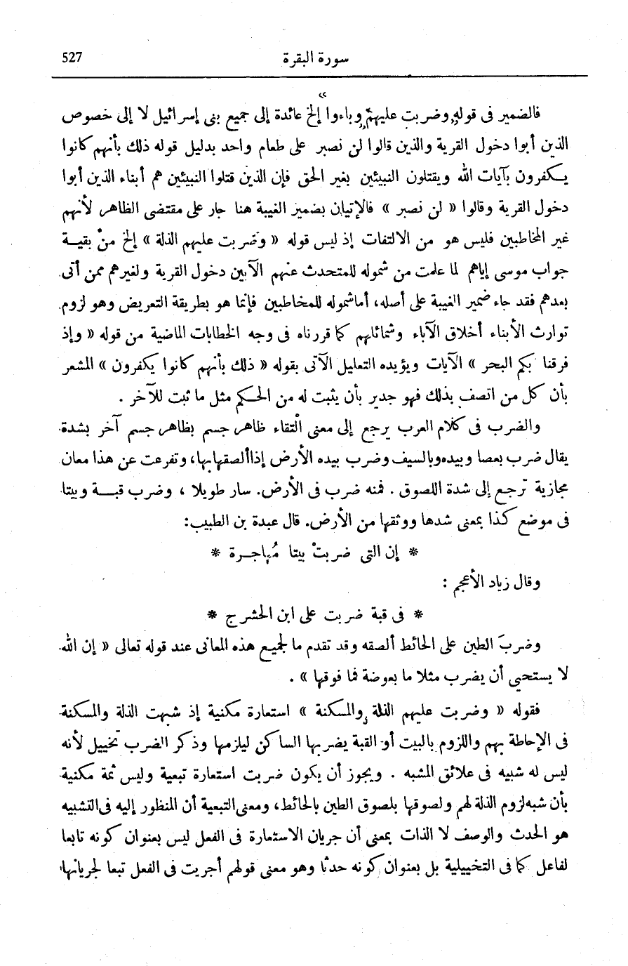 فِي الْإِحَاطَةِ بِهِمْ وَاللُّزُومِ بِالْبَيْتِ أَوِ الْقُبَّةِ يَضْرِبُهَا السَّاكِنُ لِيَلْزَمَهَا وَذِكْرُ الضَّرْبِ تَخْيِيلٌ لِأَنَّهُ لَيْسَ لَهُ شَبِيهٌ فِي عَلَائِقِ الْمُشَبَّهِ. وَيَجُوزُ أَنْ يَكُونَ ضُرِبَتِ اسْتِعَارَةً تَبَعِيَّةً وَلَيْسَ ثَمَّةَ مَكْنِيَّةً بِأَنْ شَبَّهَ لُزُومَ الذِّلَّةِ لَهُمْ وَلُصُوقَهَا بِلُصُوقِ الطِّينِ بِالْحَائِطِ، وَمَعْنَى التَّبَعِيَّةِ أَنَّ الْمَنْظُورَ إِلَيْهِ فِي التَّشْبِيهِ هُوَ الْحَدَثُ وَالْوَصْفُ لَا الذَّاتُ بِمَعْنَى أَنَّ جَرَيَانَ الِاسْتِعَارَةِ فِي الْفِعْلِ لَيْسَ بِعُنْوَانِ كَوْنِهِ تَابِعًا لِفَاعِلٍ كَمَا فِي التَّخْيِيلِيَّةِ بَلْ بِعُنْوَانِ كَوْنِهِ حَدَثًا وَهُوَ مَعْنَى قَوْلِهِمْ أُجْرِيَتْ فِي الْفِعْلِ تَبَعًا لِجَرَيَانِهَاُُ
