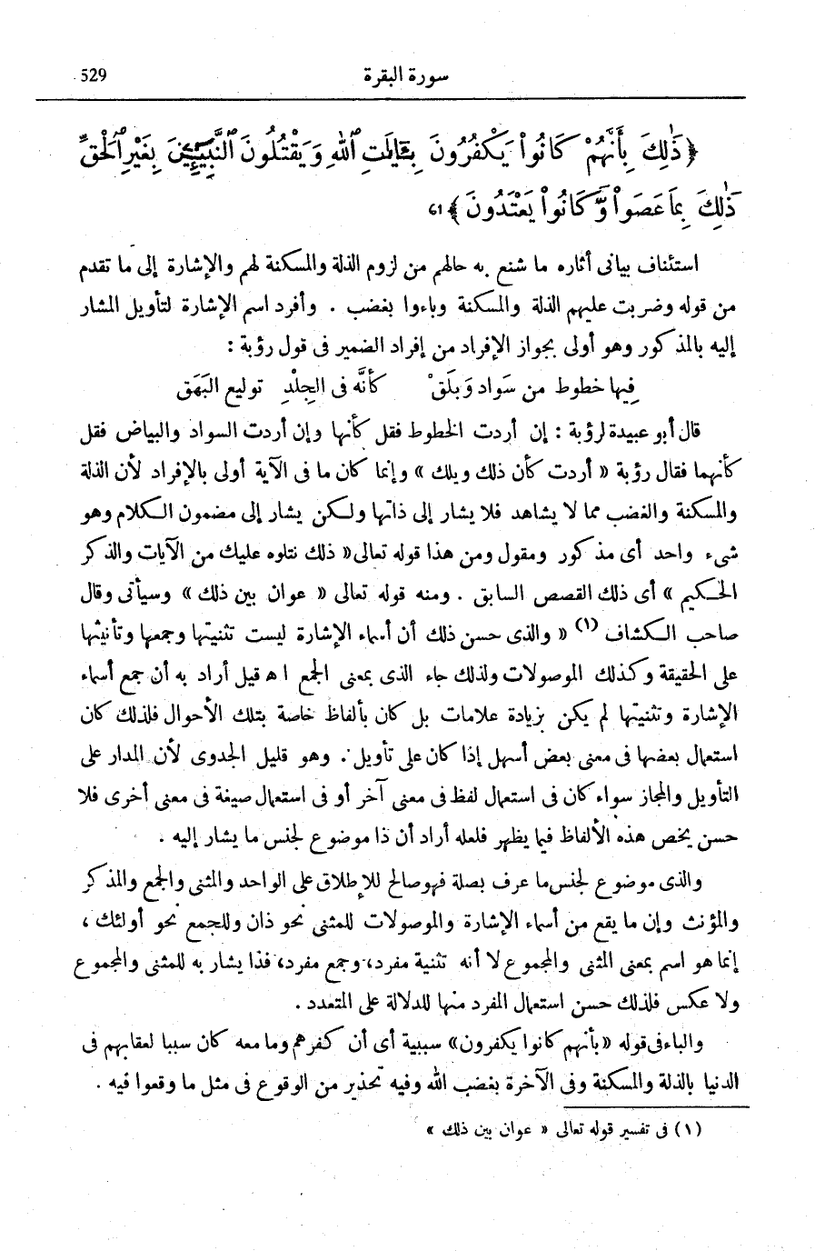 قَالَ أَبُو عُبَيْدَةَ لِرُؤْبَةَ: إِنْ أَرَدْتَ الْخُطُوطَ فَقُلْ كَأَنَّهَا وَإِنْ أَرَدْتَ السَّوَادَ وَالْبَيَاضَ فَقُلْ كَأَنَّهُمَا فَقَالَ رُؤْبَةُ: «أَرَدْتُ كَأَنَّ ذَلِكَ وَيْلَكَ» وَإِنَّمَا كَانَ مَا فِي الْآيَةِ أَوْلَى بِالْإِفْرَادِ لِأَنَّ الذِّلَّةَ وَالْمَسْكَنَةَ وَالْغَضَبَ مِمَّا لَا يُشَاهَدُ فَلَا يُشَارُ إِلَى ذَاتِهَا وَلَكِنْ يُشَارُ إِلَى مَضْمُونِ الْكَلَامِ وَهُوَ شَيْءٌ وَاحِدٌ أَيْ مَذْكُورٌ وَمَقُولٌ وَمِنْ هَذَا قَوْلُهُ تَعَالَى: ذلِكَ نَتْلُوهُ عَلَيْكَ مِنَ الْآياتِ وَالذِّكْرِ الْحَكِيمِ [آل عمرَان: 58] أَيْ ذَلِكَ الْقَصَصُ السَّابِقُ. وَمِنْهُ قَوْلُهُ تَعَالَى: عَوانٌ بَيْنَ ذلِكَ [الْبَقَرَة: 68] وَسَيَأْتِي.