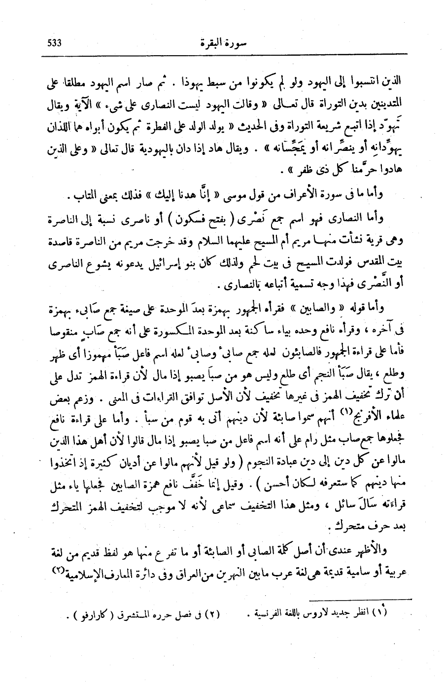 وَأما قَوْله: وَالصَّابِئِينَ فَقَرَأَهُ الْجُمْهُورُ بِهَمْزَةٍ بَعْدَ الْمُوَحَّدَةِ عَلَى صِيغَة جمع صابىء بِهَمْزَةٍ فِي آخِرِهِ، وَقَرَأَهُ نَافِعٌ وَحْدَهُ بِيَاءٍ سَاكِنَةٍ بَعْدَ الْمُوَحَّدَةِ الْمَكْسُورَةِ عَلَى أَنَّهُ جَمْعُ صَابٍ مَنْقُوصًا فَأَمَّا عَلَى قِرَاءَةِ الْجُمْهُورِ فَالصَّابِئُونَ لَعَلَّه جمع صابىء وصابىء لَعَلَّهُ اسْمُ فَاعِلِ صَبَأَ مَهْمُوزًا أَيْ ظَهَرَ وَطَلَعَ، يُقَالُ صَبَأَ النَّجْمُ أَيْ طَلَعَ وَلَيْسَ هُوَ مِنْ صَبَا يَصْبُو إِذَا مَالَ لِأَنَّ قِرَاءَةَ الْهَمْزِ تَدُلُّ عَلَى أَنَّ تَرْكَ تَخْفِيفِ الْهَمْزِ فِي غَيْرِهَا تَخْفِيفٌ لِأَنَّ الْأَصْلَ تَوَافُقُ الْقِرَاءَاتِ فِي الْمَعْنَى. وَزَعَمَ بَعْضُ عُلَمَاءِ الْإِفْرَنْجِ (¬1) أَنَّهُمْ سُمُّوا صَابِئَةً لِأَنَّ دِينَهُمْ أَتَى بِهِ قَوْمٌ مِنْ سَبَأٍ. وَأَمَّا عَلَى قِرَاءَةِ نَافِعٍ فَجَعَلُوهَا جَمْعَ صَابٍ مِثْلَ رَامٍ عَلَى أَنَّهُ اسْمُ فَاعِلٍ مِنْ صَبَا يَصْبُو إِذَا مَالَ قَالُوا: لِأَنَّ أَهْلَ هَذَا الدِّينِ مَالُوا عَنْ كُلِّ دِينٍ إِلَى دِينِ عِبَادَةِ النُّجُومِ (وَلَوْ قِيلَ لِأَنَّهُمْ مَالُوا عَنْ أَدْيَانٍ كَثِيرَةٍ إِذِ اتَّخَذُوا مِنْهَا دِينَهُمْ كَمَا سَتَعْرِفُهُ لَكَانَ أَحْسَنَ) . وَقِيلَ إِنَّمَا خَفَّفَ نَافِعٌ هَمْزَةَ (الصَّابِينَ) فَجَعَلَهَا يَاءً مِثْلَ قِرَاءَته سَأَلَ سائِلٌ [المعارج: 1] ، وَمِثْلُ هَذَا التَّخْفِيفِ سَمَاعِيٌّ لِأَنَّهُ لَا مُوجِبَ لِتَخْفِيفِ الْهَمْزِ الْمُتَحَرِّكِ بَعْدَ حَرْفٍ مُتَحَرِّكٍ.