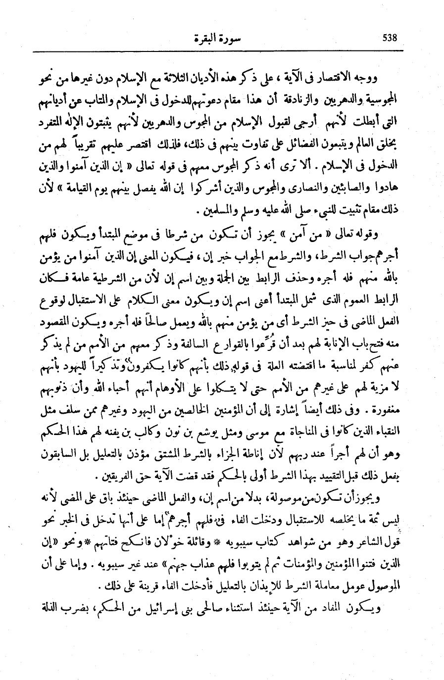 وَقَوْلُهُ تَعَالَى: مَنْ آمَنَ يَجُوزُ أَنْ تَكُونَ (مَنْ) شَرْطًا فِي مَوْضِعِ الْمُبْتَدَأِ وَيَكُونَ فَلَهُمْ أَجْرُهُمْ جَوَابَ الشَّرْطِ، وَالشَّرْطُ مَعَ الْجَوَابِ خَبَرُ إِنَّ، فَيَكُونُ الْمَعْنَى إِنَّ الَّذِينَ آمَنُوا مَنْ يُؤْمِنُ بِاللَّهِ مِنْهُمْ فَلَهُ أَجْرُهُ وَحُذِفَ الرَّابِطُ بَيْنَ الْجُمْلَةِ وَبَيْنَ اسْمِ (إِنَّ) لِأَنَّ (مَنِ) الشَّرْطِيَّةَ عَامَّةٌ فَكَانَ الرَّابِطُ الْعُمُومَ الَّذِي شَمِلَ الْمُبْتَدَأَ أَعْنِي اسْمَ (إِنَّ) وَيَكُونُ مَعْنَى الْكَلَامِ عَلَى الِاسْتِقْبَالِ لِوُقُوعِ الْفِعْلِ الْمَاضِي فِي حَيِّزِ الشَّرْطِ أَيْ مَنْ يُؤْمِنْ مِنْهُمْ بِاللَّهِ وَيَعْمَلْ صَالِحًا فَلَهُ أَجْرُهُ وَيَكُونُ الْمَقْصُودُ مِنْهُ فَتْحَ بَابِ الْإِنَابَةِ لَهُمْ بَعْدَ أَنْ قُرِعُوا بِالْقَوَارِعِ السَّالِفَةِ وَذُكِرَ مَعَهُمْ مِنَ الْأُمَمِ مَنْ لَمْ يُذْكَرْ عَنْهُمْ كُفْرٌ لِمُنَاسَبَةِ مَا اقْتَضَتْهُ الْعِلَّةُ فِي قَوْلِهِ: ذلِكَ بِأَنَّهُمْ كانُوا يَكْفُرُونَ [الْبَقَرَة: 61] وَتَذْكِيرًا لِلْيَهُودِ بِأَنَّهُمْ لَا مَزِيَّةَ لَهُمْ عَلَى غَيْرِهِمْ مِنَ الْأُمَمِ حَتَّى لَا يَتَّكِلُوا عَلَى الْأَوْهَامِ أَنَّهُمْ أَحِبَّاءُ اللَّهِ وَأَنَّ ذُنُوبَهُمْ مَغْفُورَةٌ. وَفِي ذَلِكَ أَيْضًا إِشَارَةٌ إِلَى أَنَّ الْمُؤْمِنِينَ