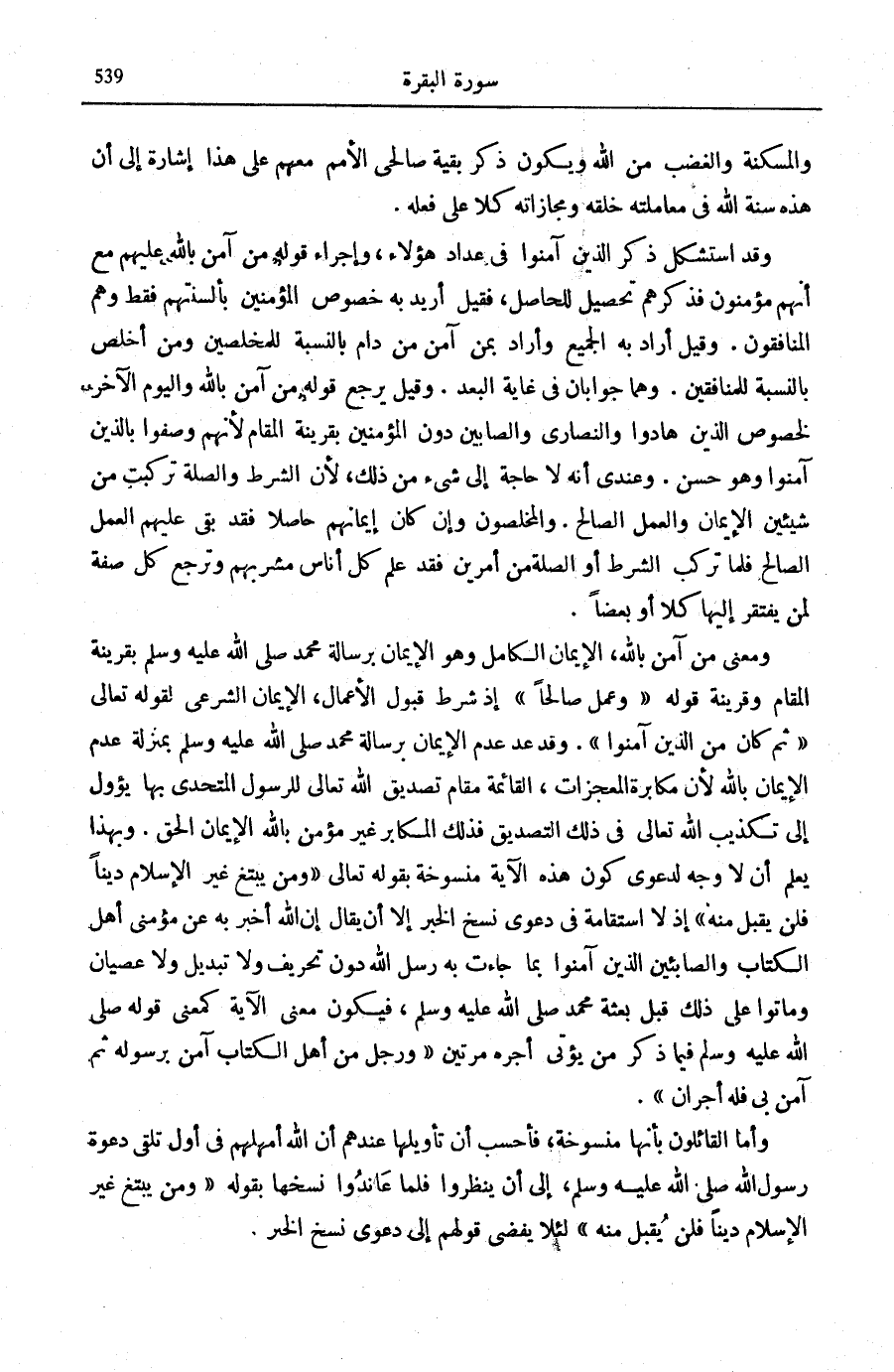 وَبِهَذَا يُعْلَمُ أَنْ لَا وَجْهَ لِدَعْوَى كَوْنِ هَذِهِ الْآيَةِ مَنْسُوخَةً بِقَوْلِهِ تَعَالَى: وَمَنْ يَبْتَغِ غَيْرَ الْإِسْلامِ دِيناً فَلَنْ يُقْبَلَ مِنْهُ [آل عمرَان: 85] إِذْ لَا اسْتِقَامَةَ فِي دَعْوَى نَسْخِ الْخَبَرِ إِلَّا أَنْ يُقَالَ إِنَّ اللَّهَ أَخْبَرَ بِهِ عَنْ مُؤْمِنِي أَهْلِ الْكِتَابِ وَالصَّابِئِينَ الَّذِينَ آمَنُوا بِمَا جَاءَتْ بِهِ رُسُلُ اللَّهِ دُونَ تَحْرِيفٍ وَلَا تَبْدِيلٍ وَلَا عِصْيَانٍ وَمَاتُوا عَلَى ذَلِكَ قَبْلَ بَعْثَةِ مُحَمَّدٍ صَلَّى اللهُ عَلَيْهِ وَسَلَّمَ، فَيَكُونُ مَعْنَى الْآيَةِ كَمَعْنَى