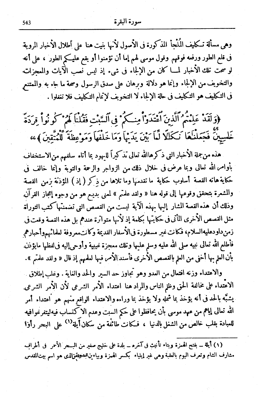 (¬1) أَيْلَة: بِفَتْح الْهمزَة وبتاء تَأْنِيث فِي آخِره بَلْدَة على خليج صَغِير من الْبَحْر الْأَحْمَر فِي أَطْرَاف مشارف الشَّام وتعرف الْيَوْم بِالْعقبَةِ وَهِي غير إيلياء بِكَسْر الْهمزَة وبياءين ممدودتين الَّذِي هُوَ اسْم بَيت الْمُقَدّس.