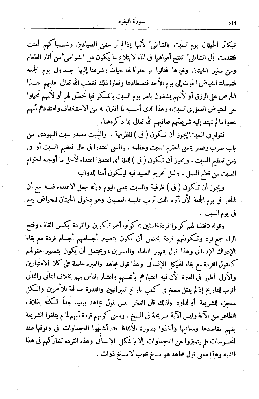 وَمَعْنَى كَوْنِهِمْ قِرَدَةً أَنَّهُمْ لَمَّا لَمْ يَتَلَقَّوُا الشَّرِيعَةَ بِفَهْمِ مَقَاصِدِهَا وَمَعَانِيهَا وَأَخَذُوا بِصُورَةِ الْأَلْفَاظِ فَقَدْ أَشْبَهُوا الْعَجْمَاوَاتِ فِي وُقُوفِهَا عِنْدَ الْمَحْسُوسَاتِ فَلَمْ يَتَمَيَّزُوا عَنِ الْعَجْمَاوَاتِ إِلَّا بِالشَّكْلِ الْإِنْسَانِيِّ وَهَذِهِ الْقِرَدَةُ تُشَارِكُهُمْ فِي هَذَا الشَّبَهِ وَهَذَا مَعْنَى قَوْلِ مُجَاهِدٍ هُوَ مَسْخُ قُلُوبٍ لَا مَسْخُ ذَوَاتٍ.